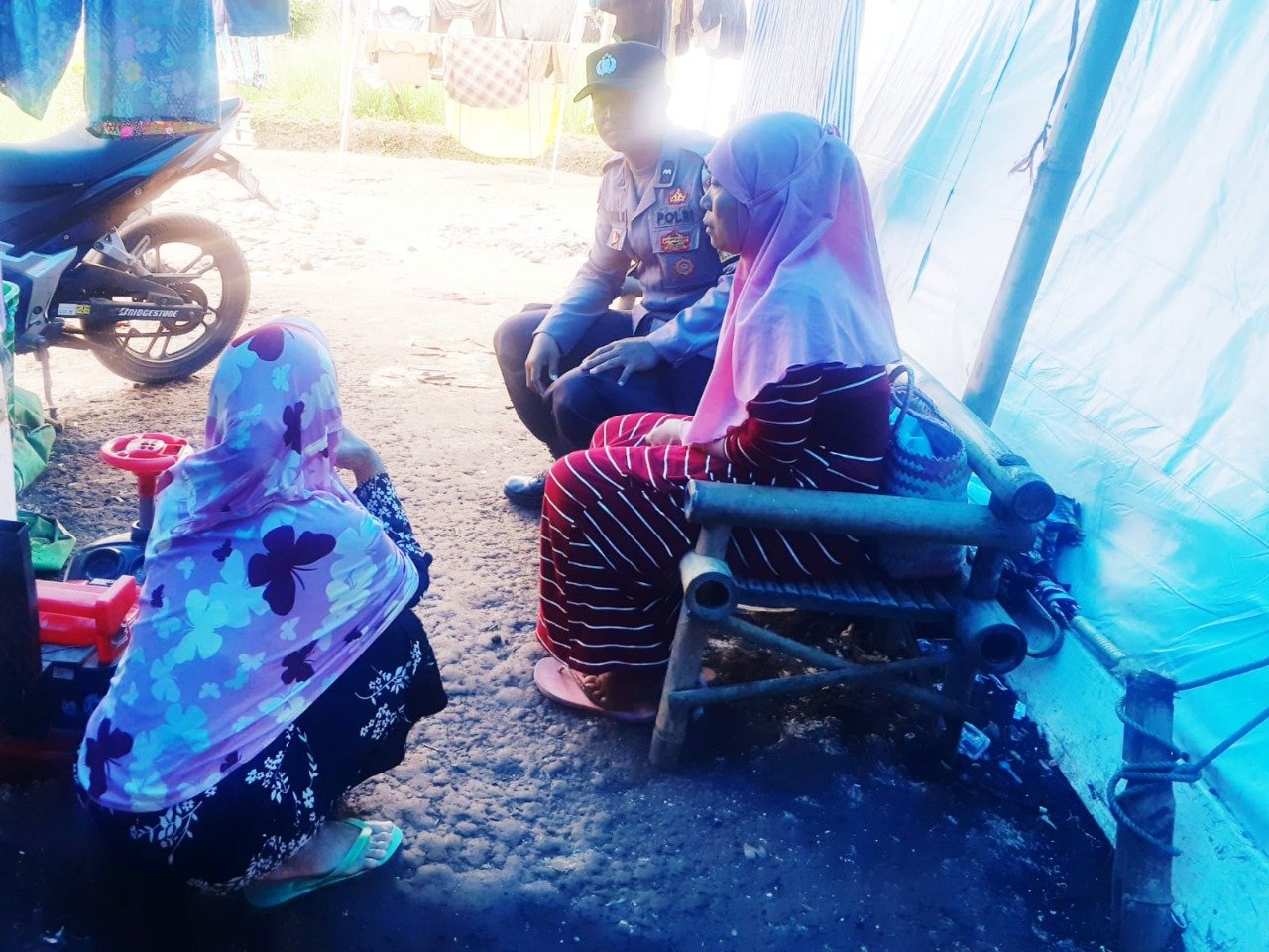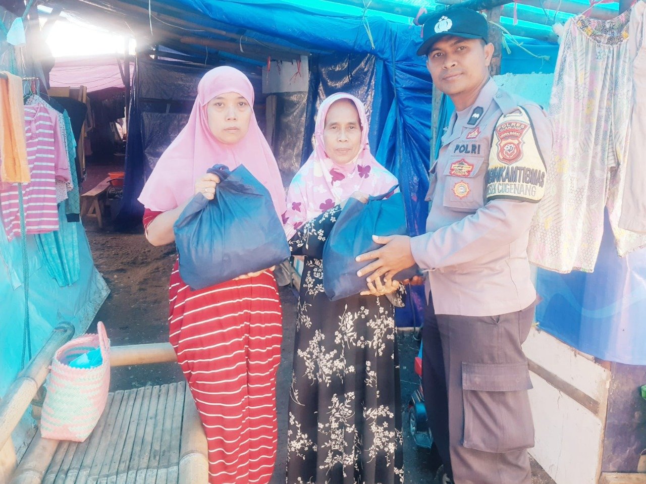 Bhabinkamtibmas Polsek Cugenang Desa Benjot Aipda Azmal berikan Bantuan Sembako kepada Warga yang mengungsi di Kampung Padaarum Desa Benjot Kecamatan Cugenang.