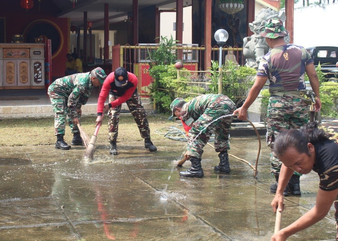 BN News. Banyumas || Puluhan personil gabungan dari Koramil 04/Sokaraja, Polsek Sokaraja, Pemcam Sokaraja, FKUB dan Ormas yang dibantu oleh masyarakat melaksanakan pembersihan tempat ibadah di Klenteng Hok Tek Bio Jln. Jenderal Sudirman No.03 Desa Sokaraja Kidul, Kecamatan Sokaraja, Kabupaten Banyumas. (20/01/2023).