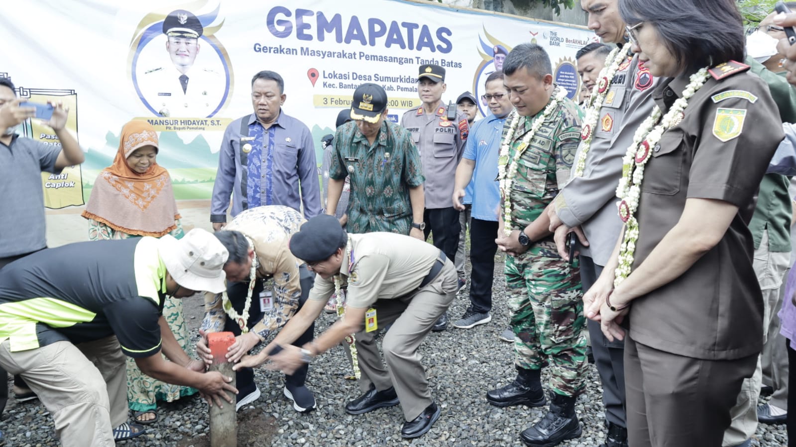 BN News. Pemalang || Komandan Kodim (Dandim) 0711/Pemalang Letkol Inf Ade Afri Verdaniex, S.I.P., bersama unsur Forkopimda menyaksikan pencanangan Gerakan Masyarakat Pemasangan Tanda Batas (GEMA PATAS) 1 juta patok bidang tanah secara serentak di seluruh Indonesia dengan tema “Pasang Patok, Anti Cekcok, Anti Caplok” oleh Plt. Bupati Pemalang Mansur Hidayat, ST.
