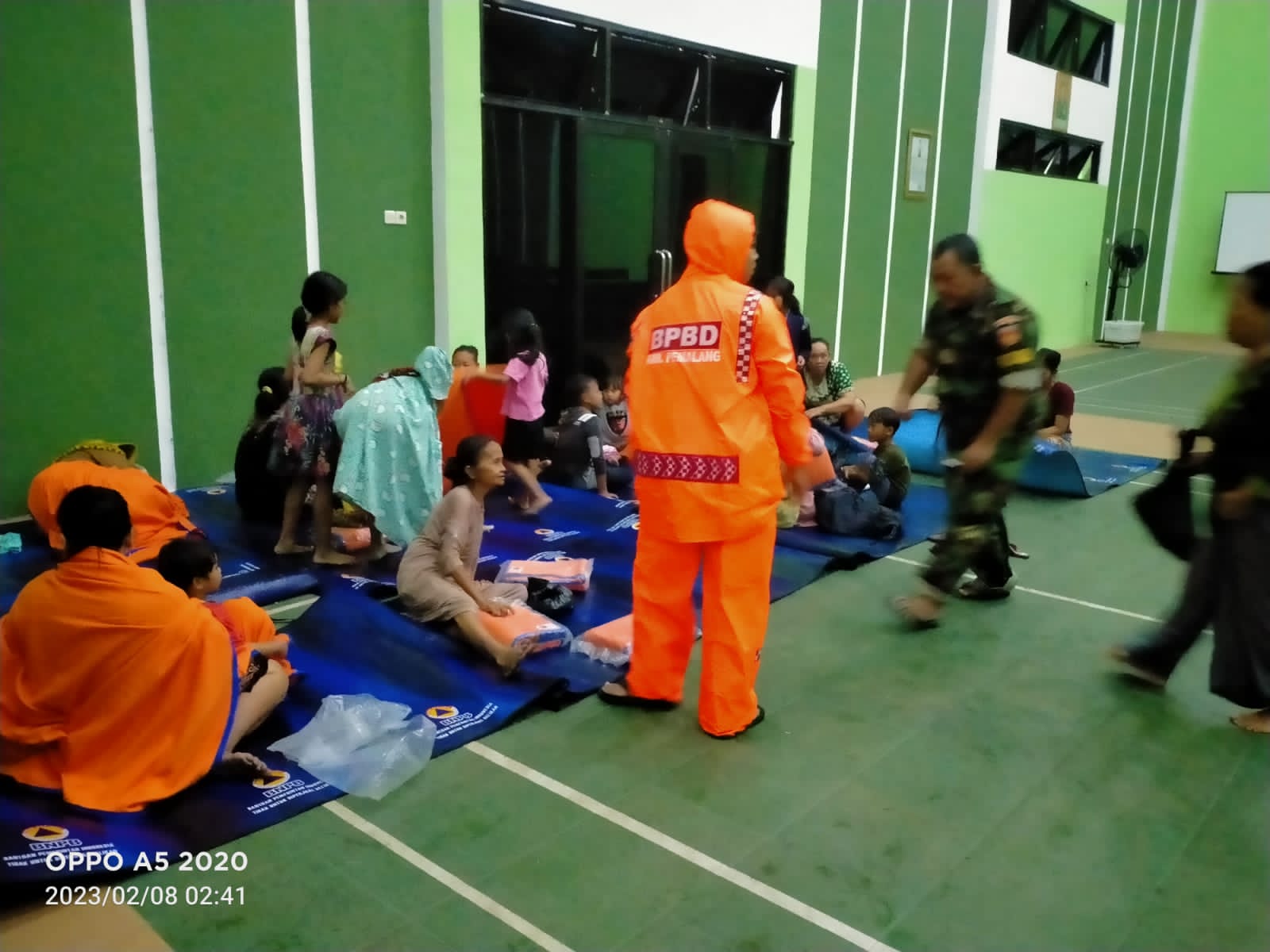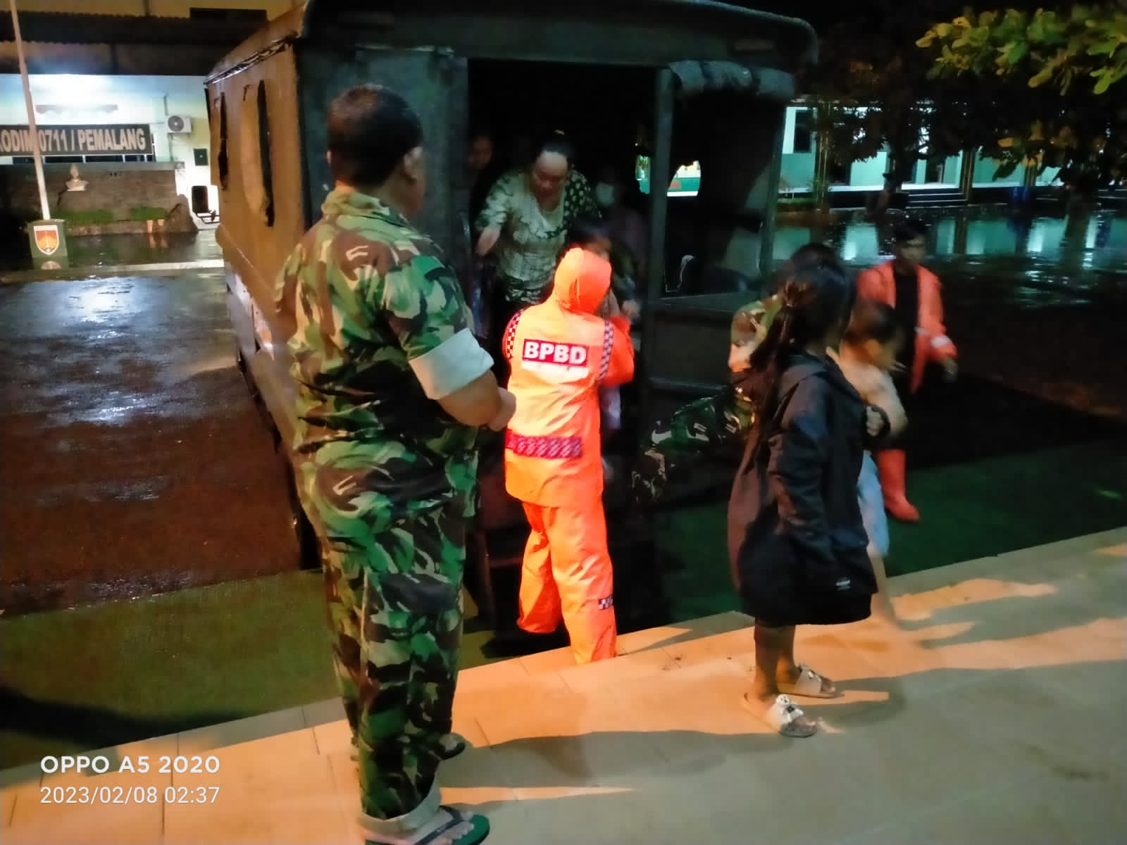 BN News. Pemalang || Prajurit Kodim 0711/Pemalang bersama Badan Penanggulangan Bencana Daerah (BPBD) dibawah pimpinan Pasi Intel Kapten Inf Teguh Wibowo mengevakuasi puluhan warga dukuh Cokrah RT 01/09 dan RT 02/10 kelurahan Sugihwaras Kec/Kab. Pemalang korban banjir di Aula Kodim 0711/Pemalang, Rabu dini hari (8/2/2023).