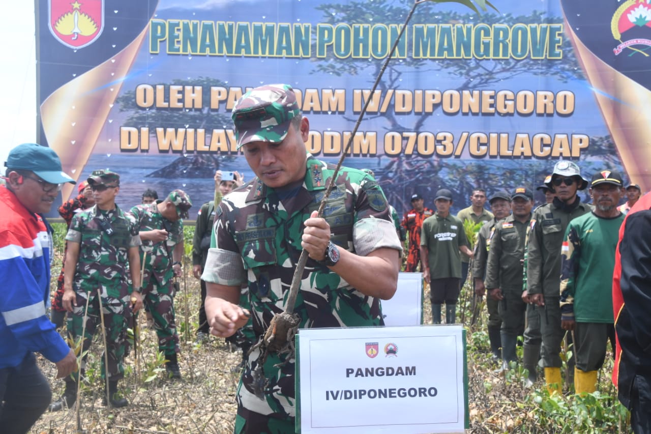 BN News. Cilacap || Turut menjaga dan melestarikan alam serta lingkungan Kabupaten Cilacap, Pangdam IV/Diponegoro Mayjen TNI Widi Prasetijono bersama Pj Bupati Cilacap Yunita Dyah Suminar menanam 5000 bibit pohon mangrove di Desa Tritih Lor, Kecamatan Jeruklegi. Rabu (15/02/2023).