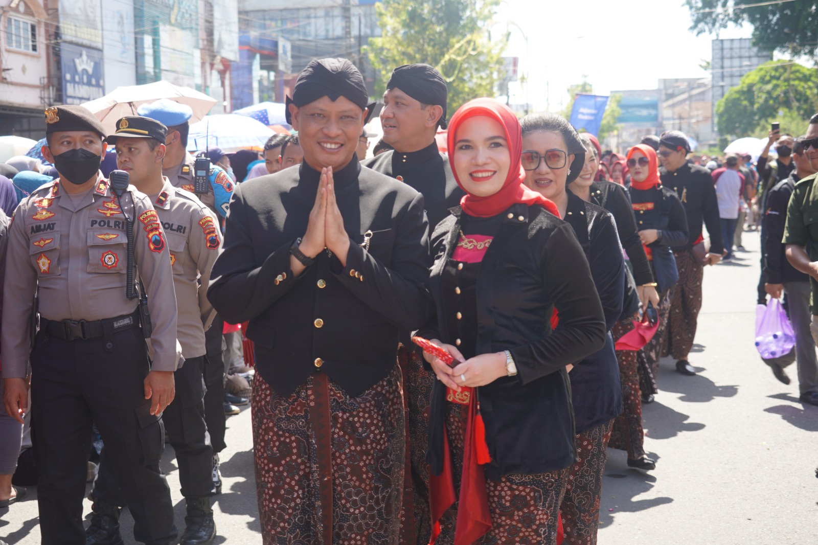 Dengan mengenakan pakaian tradisional Banyumas, Danrem 071/Wijayakusuma Kolonel Inf Yudha Airlangga, S.E., beserta Ketua Persit Kartika Chandra Kirana Koorcab Rem 071 PD IV/Diponegoro Ny. Natania Yudha Airlangga, mengikuti prosesi Kirab Pusaka Banyumas dari Pendopo Wakil Bupati Banyumas menuju pelataran Alun-alun Purwokerto.