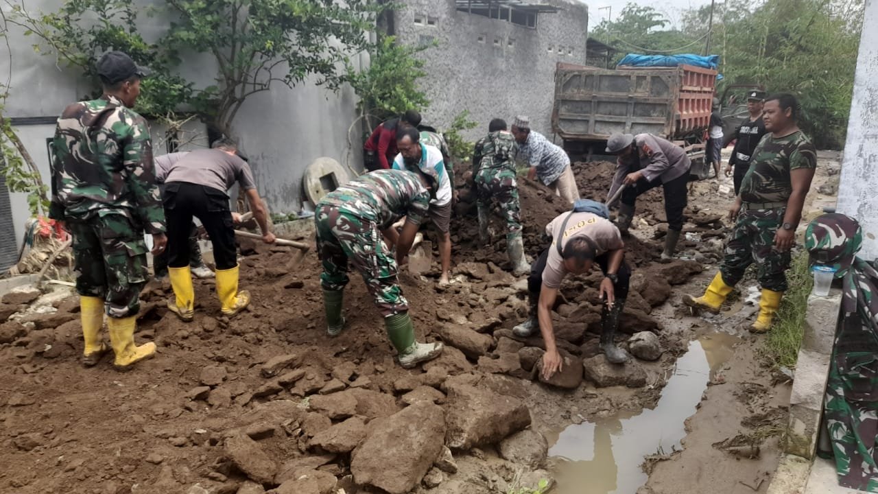 BN News. Demak || Koramil 12/Mranggen dan Polsek Mranggen bergotong-royong perbaiki akses jalan Pasca banjir di Desa Kebonbatur di pemukiman Perum Arion Mas 6 Desa Kebonbatur terganggu akibat pasca banjir luapan sungai Babon.