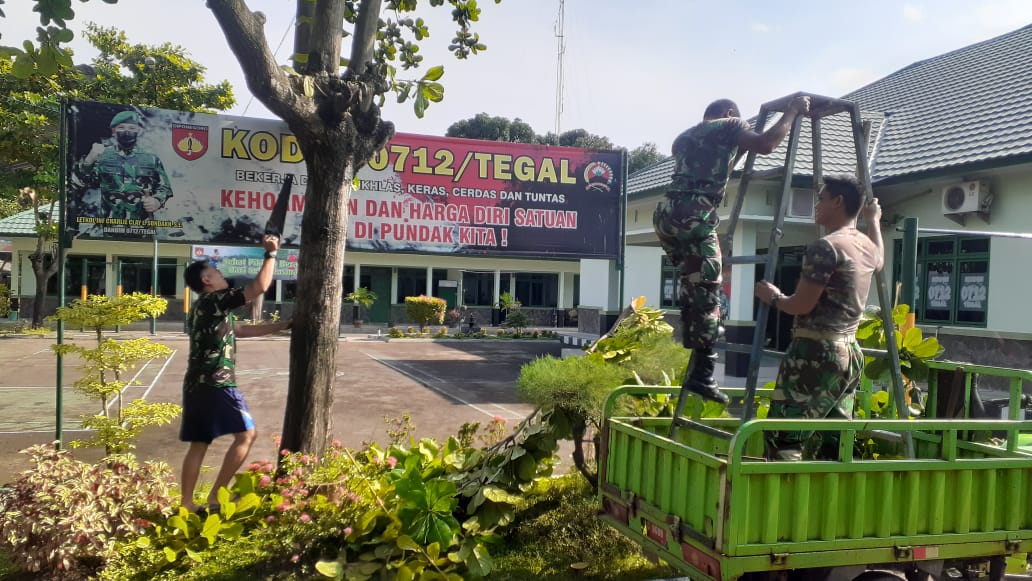Dandim 0712/Tegal Letkol Inf Charlie Clay L.Sondakh melalui Kepala Staf Kodim 0712/Tegal Mayor Cba Eko Budi Sardjono menyampaikan penebangan pohon di dilakukan di sejumlah titik yang berada di Makodim 0712/Tegal yang dinilai banyak pohon rindang dan memiliki akar lapuk.