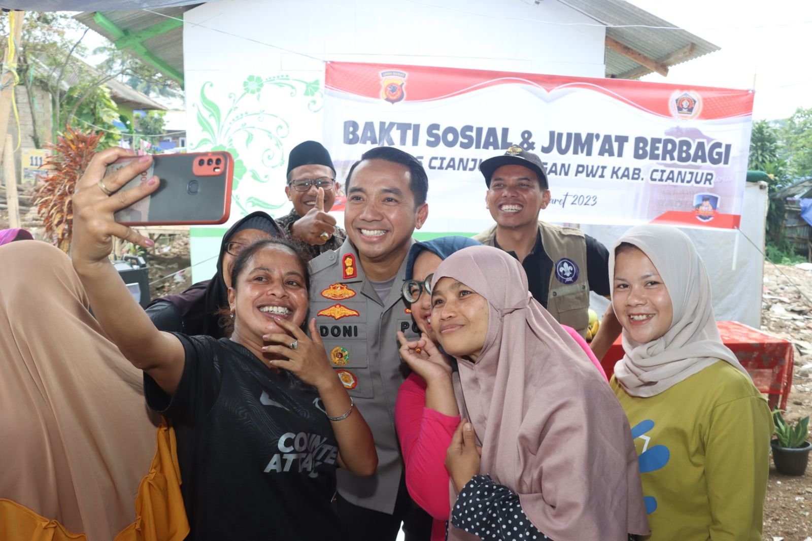 BN NEWS, CIANJUR || Polres Cianjur Bersama PWI Kabupaten Cianjur menggelar Bakti Sosial dan Jum’at Berbagi kepada masyarakat korban bencana gempa bumi di Kampung Pangkalan Desa Benjot Kecamatan Cugenang, Jumat (10/03/2023).