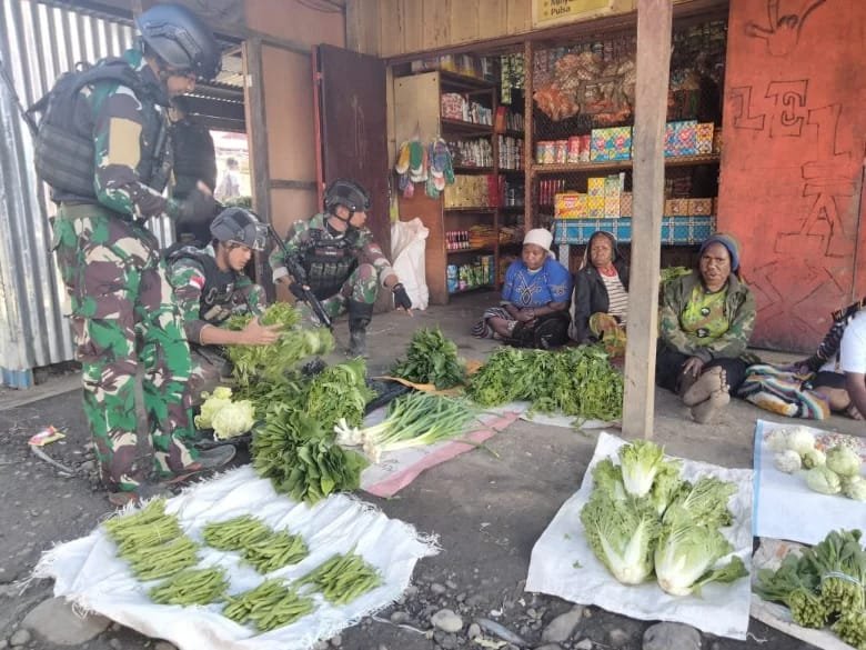BN NEWS || Ilaga ~ Sebagai wujud kepedulian untuk meningkatkan kesejahteraan masyarakat, Satgas Yonif Raider 303 Pos Eromaga memborong hasil kebun masyarakat yang dijual Mama-mama di Pasar Kago Distrik Ilaga, Kab. Puncak, Papua, Minggu (11/6/2023).
