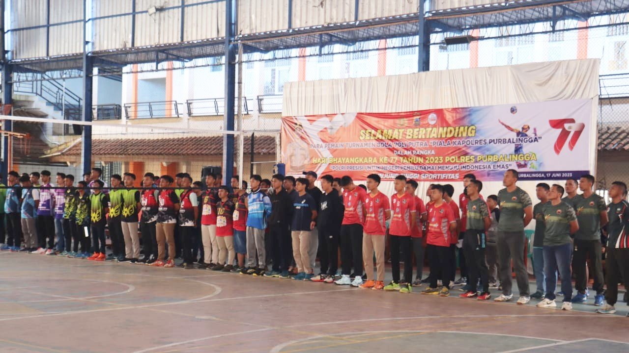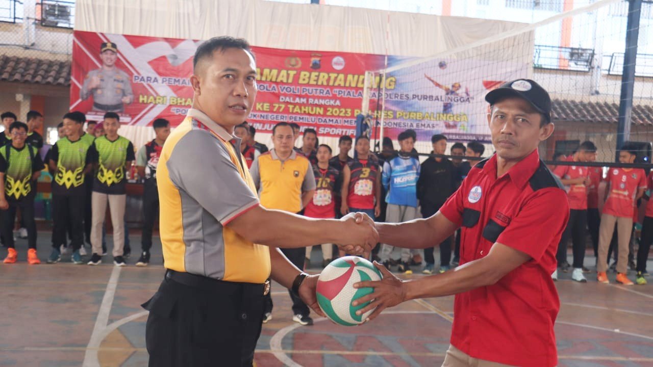 Pembukaan Turnamen Bola Voli Hari Bhayangkara ke-77 Polres Purbalingga ditandai dengan penyerahan bola kepada perwakilan dari PBVSI Purbalingga sebagai perangkat pertandingan. Turnamen diikuti oleh 20 tim dari berbagai kecamatan di wilayah Kabupaten Purbalingga.