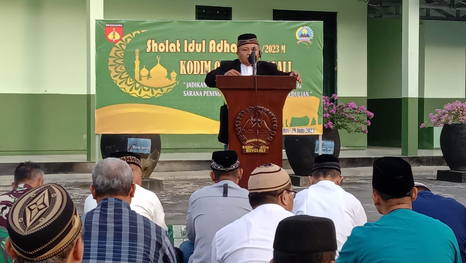BN News. Boyolali || Kodim 0724/Boyolali beserta jajaran menggelar shalat Idul Adha 1444 H tahun 2023 bersama masyarakat sekitar di Lapangan Makodim 0724/Boyolali Jalan Padanaran Desa Tegalmulyo Kecamatan Mojosongo Kabupaten Boyolali. Kamis ( 29/06/23)