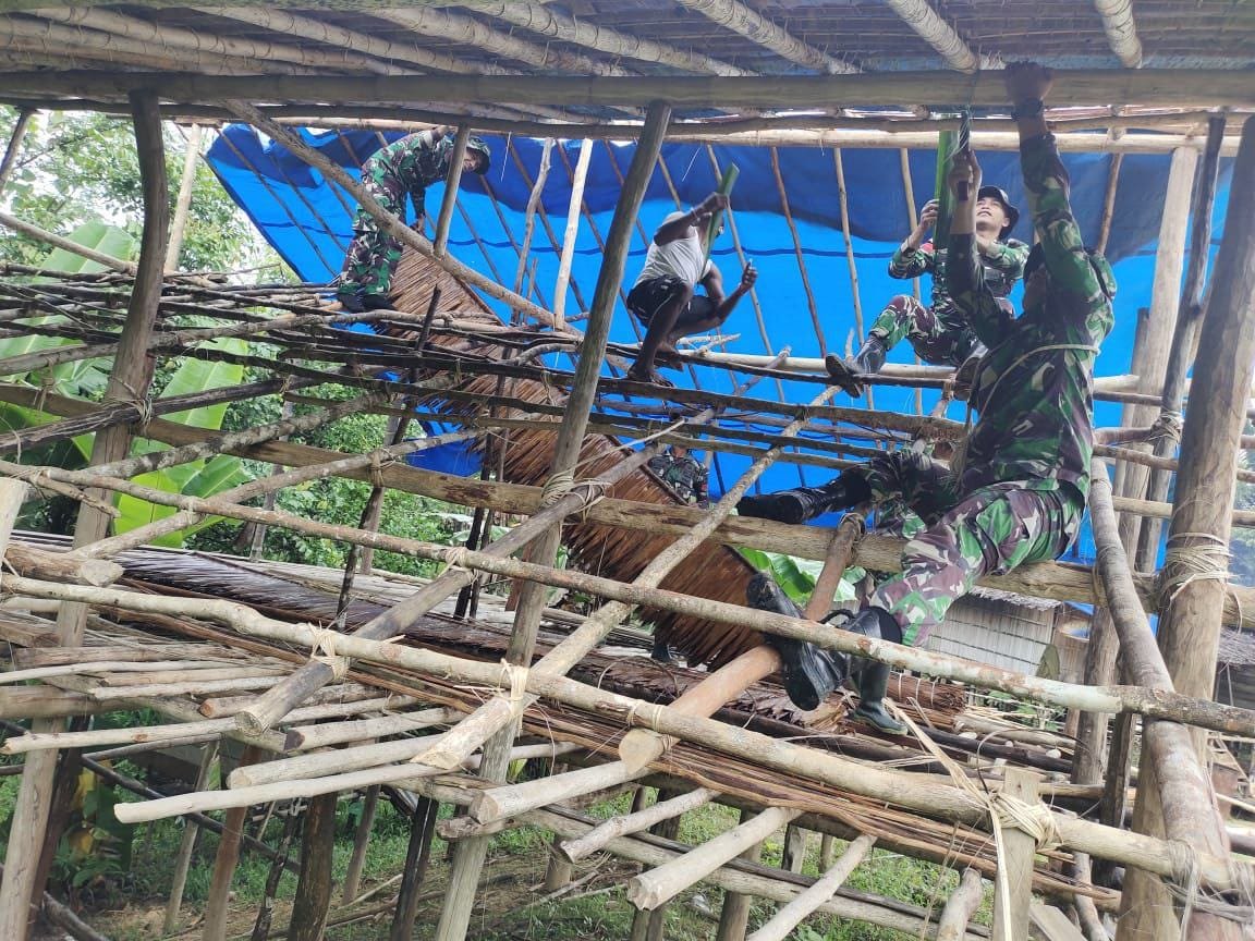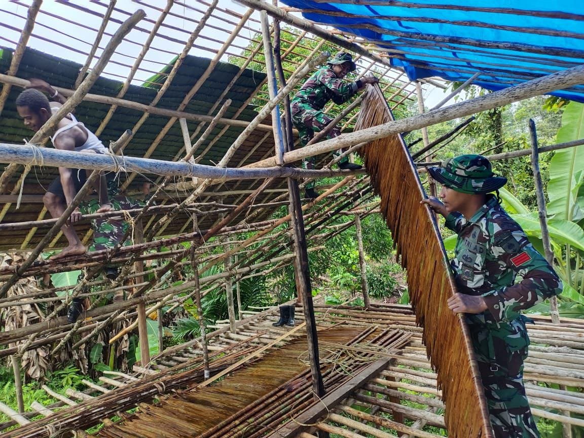 BN NEWS || Boven Digoel – Selalu hadir ditengah kesulitan masyarakat, Satgas Pamtas RI-PNG Yonif 725/Woroagi membantu perbaikan rumah tradisional milik warga perbatasan bernama Bpk. Jhon tepatnya di Kampung Upkim, Distrik Waropko, Kab. Boven Digoel, Papua Selatan.