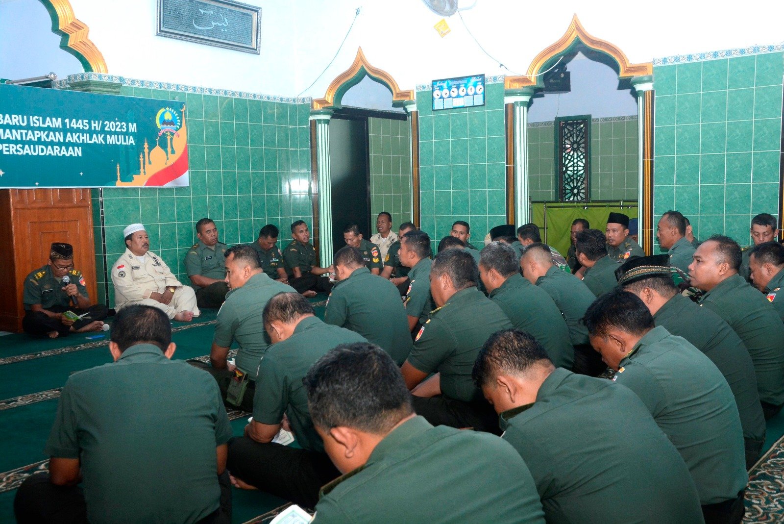 Pada kesempatan ini Mayor Inf Ismael, Sos dalam sambutannya menuturkan, “Pertama-tama kita semua patut memanjatkan puji dan syukur kehadirat Allah SWT, yang telah memberikan kesempatan umur yang panjang sehingga kita bisa melewati tahun 1444 Hijriah kemarin dan dapat menapaki tahun baru 1 Muharram 1445 Hijriah dalam keadaan sehat walafiat,” Ucapnya.