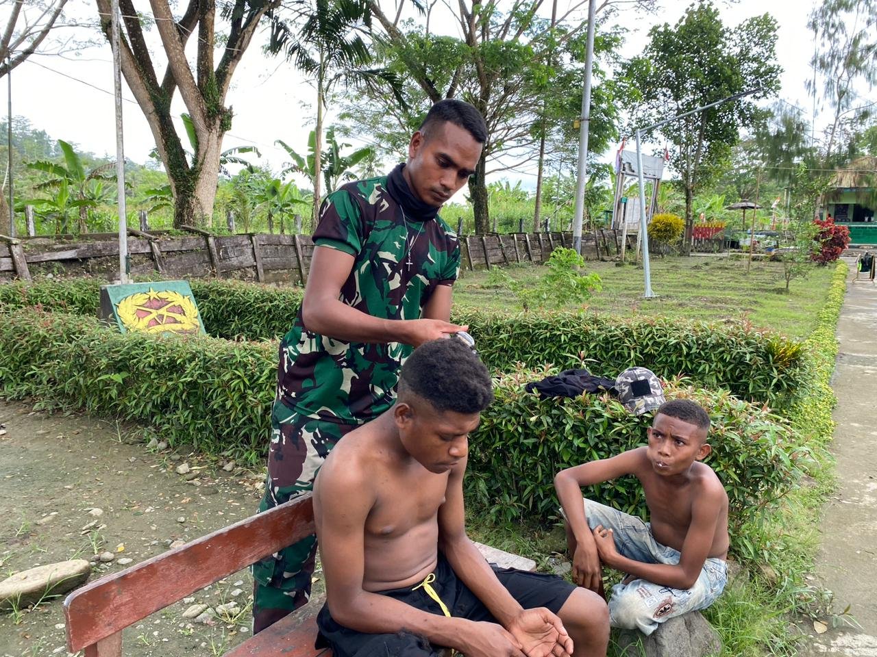 BN NEWS || Kab.Keerom – Wujud kepedulian Satgas Pamtas Statis RI-PNG Yonif 122/Tombak Sakti Pos Waris, membantu anak-anak Papua berpenampilan rapi dengan memangkas rambut anak-anak Papua, Bertempat, Kp.Banda Distrik Waris Kab.Keerom Provinsi Papua, Minggu (30/7/2023).