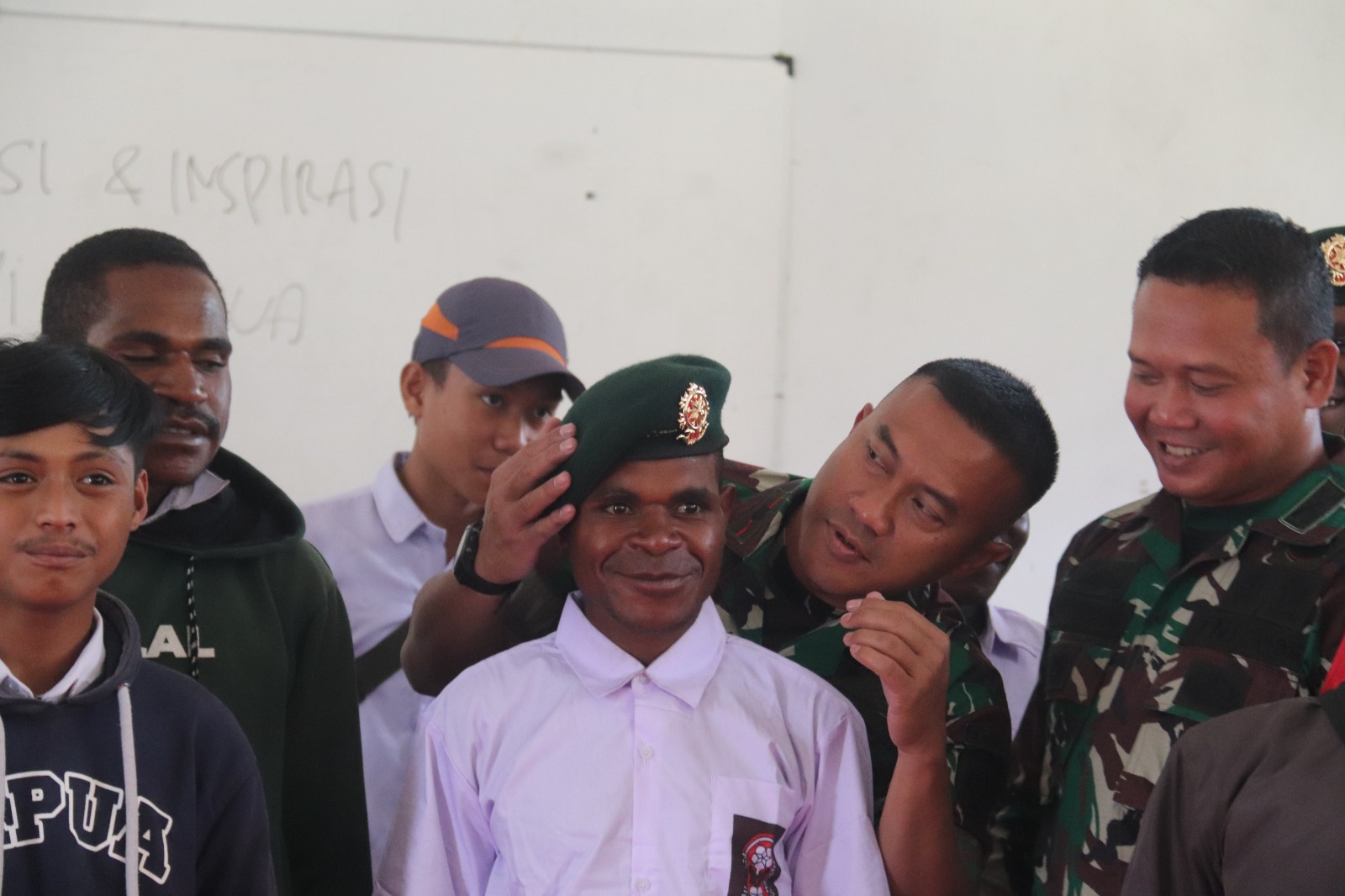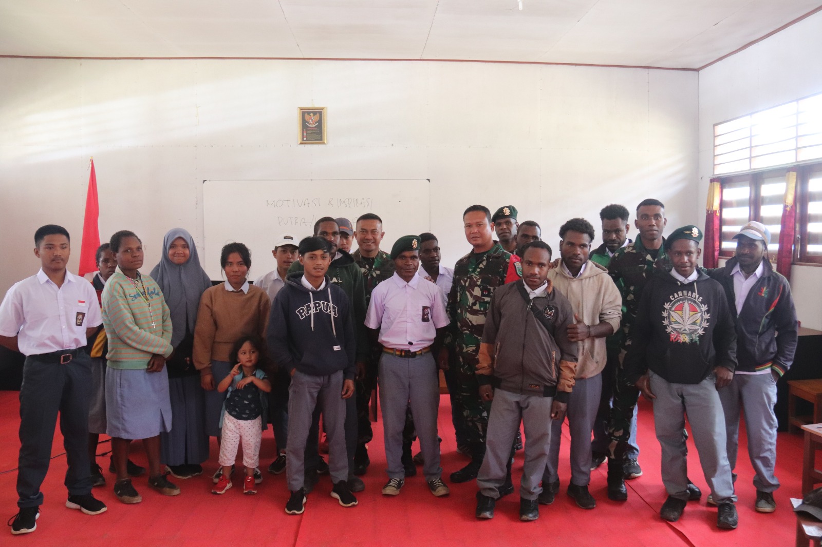 Disela-sela kegiatan sosialisasi, Dansatgas memberikan waktu khusus kepada 2 orang prajurit Satgas Yonif PR 330 putra asli papua untuk memberikan motivasi dan inspirasi kepada para peserta.