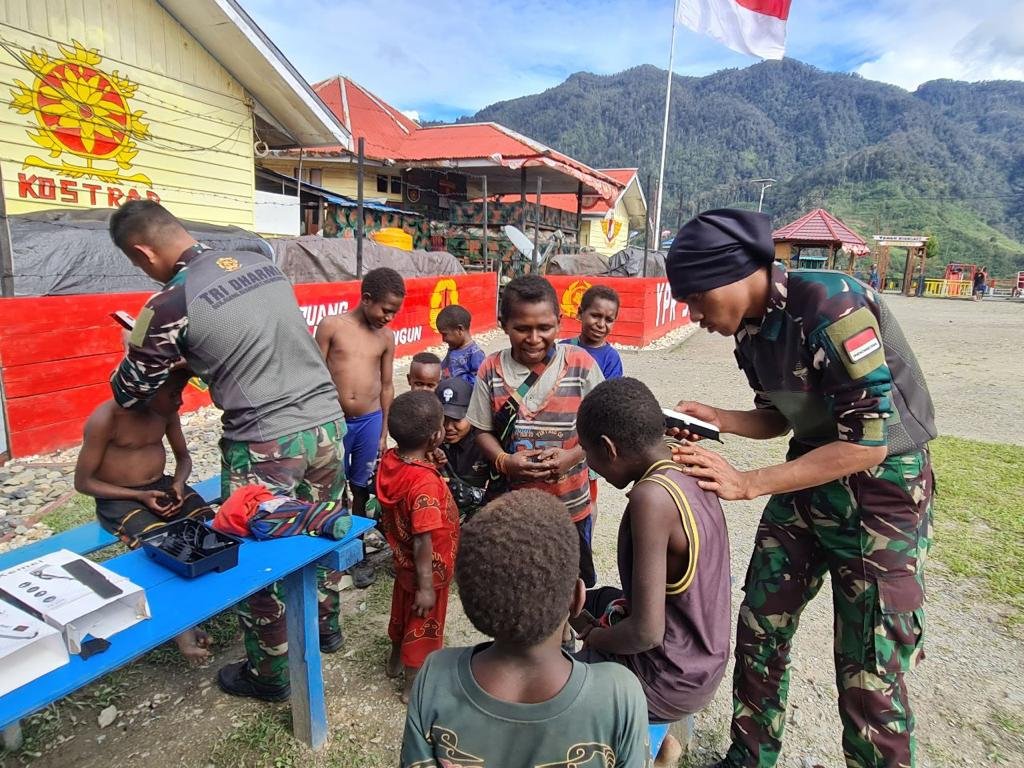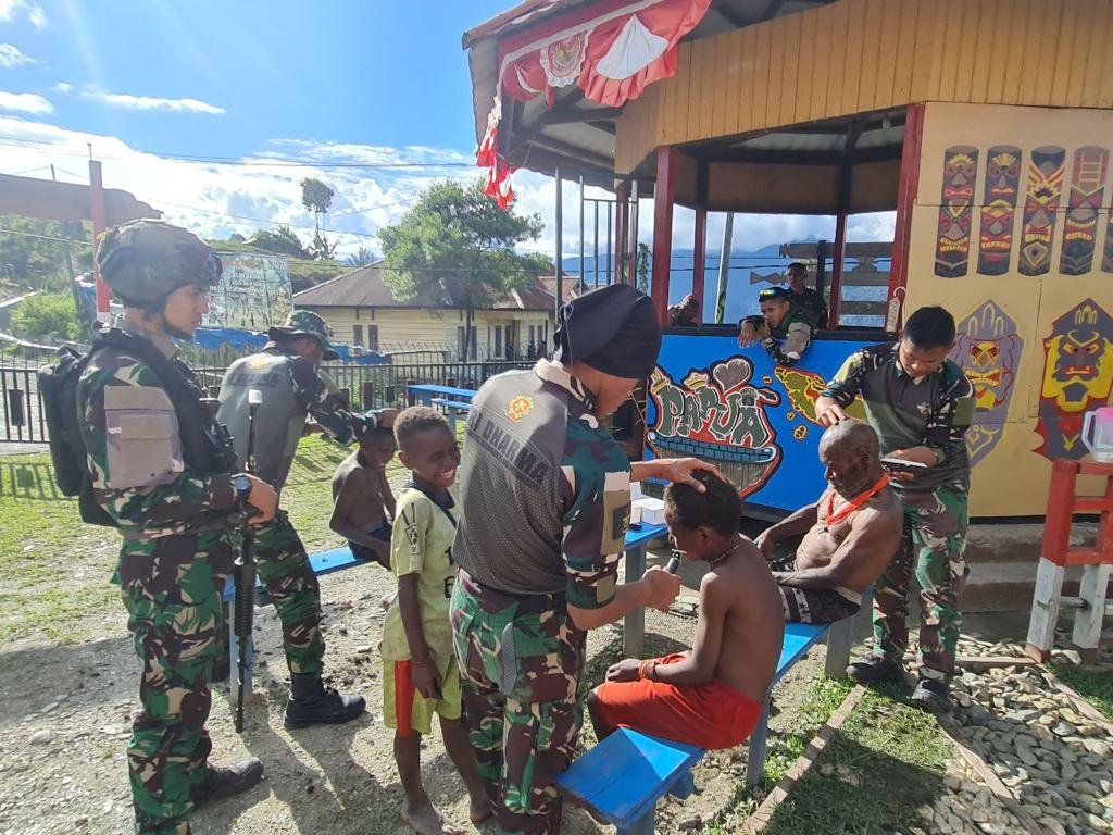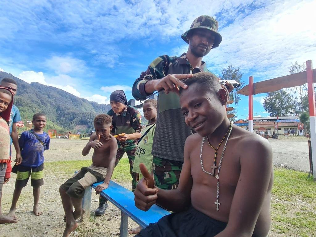 BN NEWS || Intan Jaya – Sejak launching “KOTEKA BARBER SHOP” pada pertengahan bulan Juli lalu, layanan potong rambut gratis yang digelar Satgas Yonif Para Raider 330/Tri Dharma semakin hari semakin menjadi primadona warga di Intan Jaya. Suasana ramainya warga yang antri menunggu giliran potong rambut terlihat di sejumlah Pos Satgas Yonif Para Raider 330/Tri Dharma yang ada di Kab. Intan Jaya, Prov. Papua Tengah, pada Kamis (07/09/23)