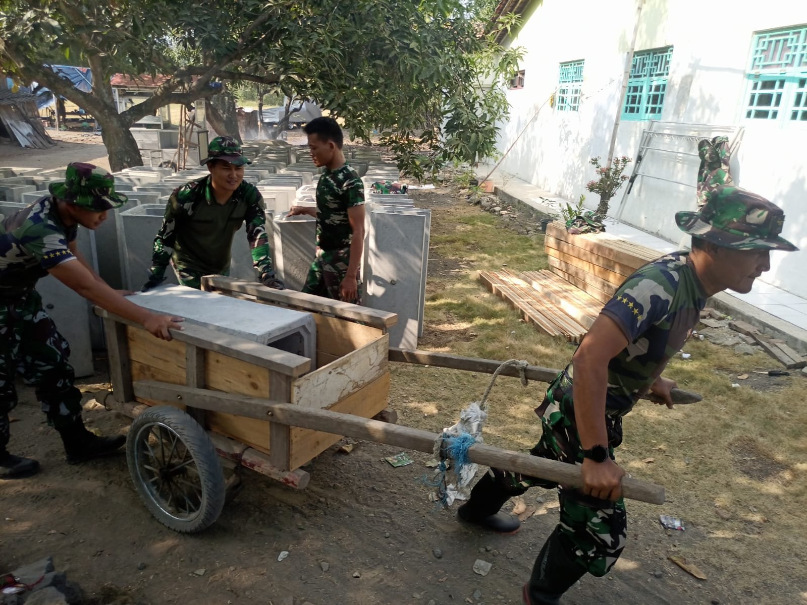 Memasuki hari kedua pelaksanaan kegiatan TNI Manunggal Membangun Desa (TMMD) Sengkuyung tahap III tahun 2023 Kodim 0711/Pemalang di desa Danasari kecamatan Pemalang, Satgas TMMD bersama warga mengangkut U-Ditch menggunakan gerobak untuk membangun saluran.