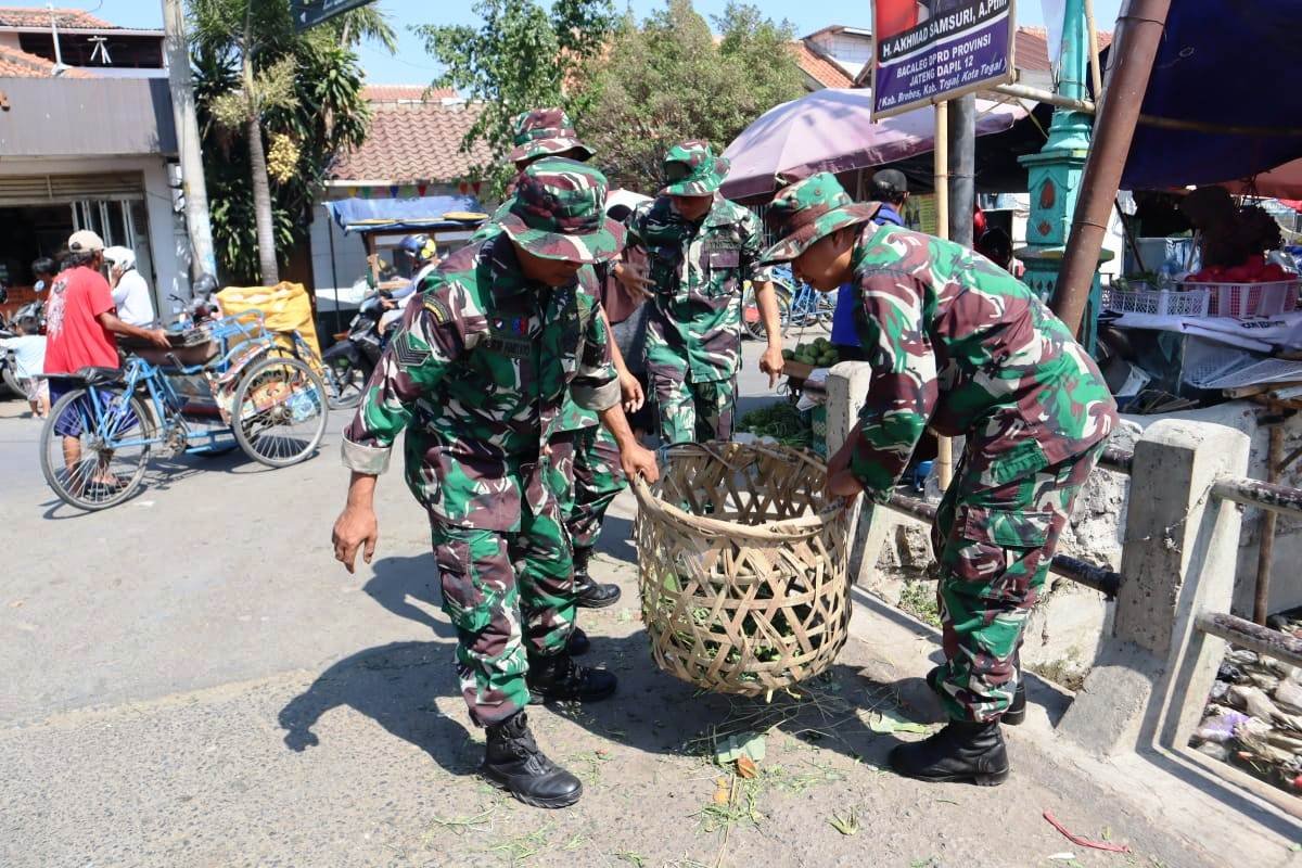 BN News. Brebes || Puluhan anggota TNI dari Kodim 0713/Brebes kembali melakukan kegiatan bersih-bersih lingkungan Pasar Belakang Kodim. Senin pagi (25/9/2023).