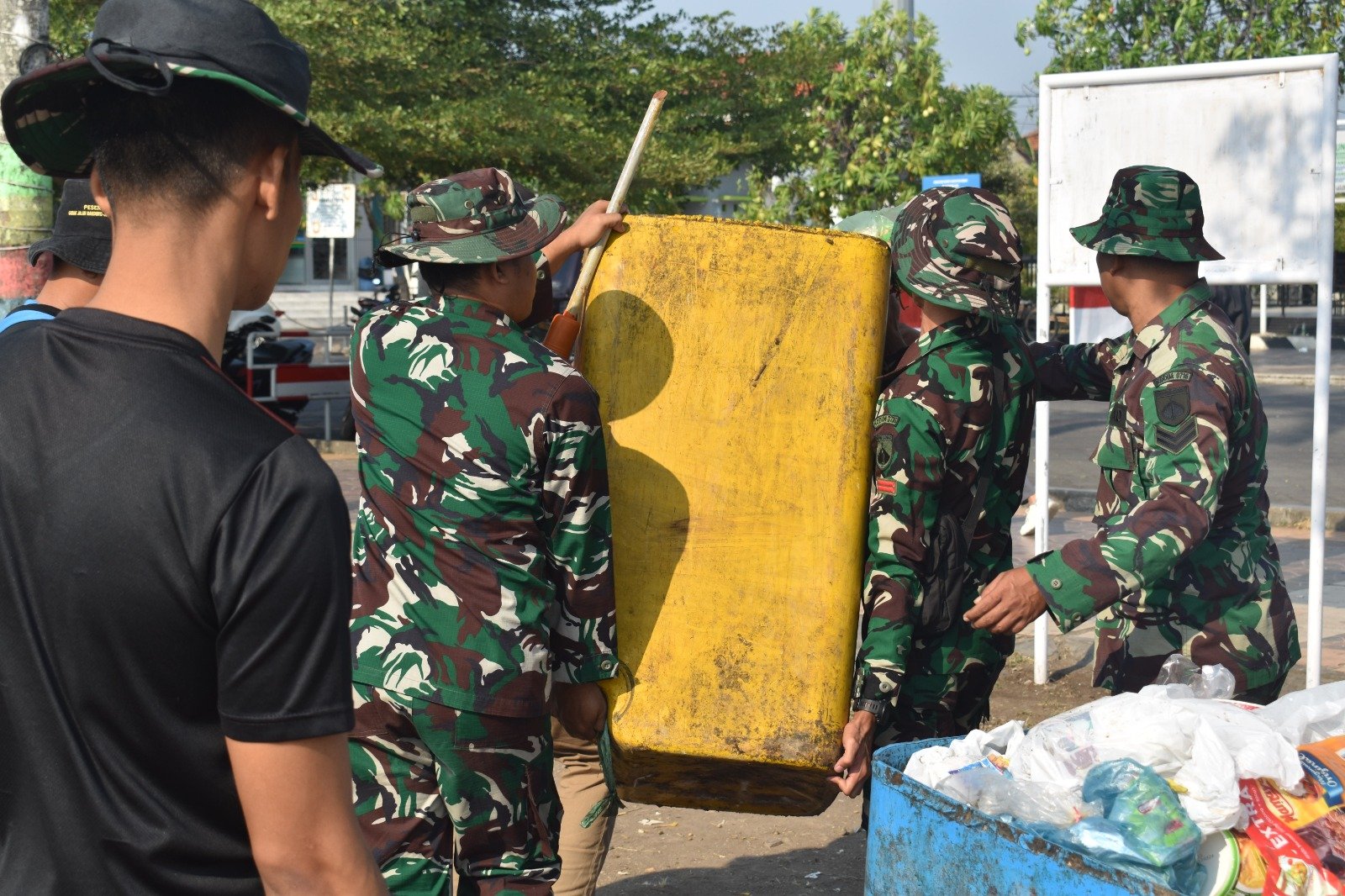 Pembersihan dimulai dari halaman depan komplek Masjid Agung Demak, dimana banyak sampah bungkus makanan yang dibuang sembarangan di bawah pepohonan dan dedaunan kering yang berserakan diterpa angin. Pembersihan dilanjutkan di seputar taman yang berada di sepanjang pinggiran lapangan alun-alun Kabupaten Demak. (Sumber : Pendim 0716/Demak//Jurnalis : Warto).