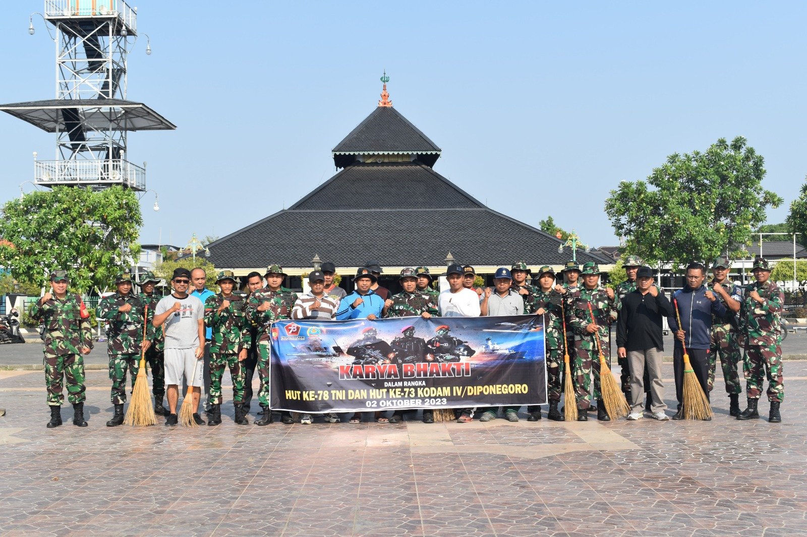 BN News. Demak || Kodim 0716/Demak menggelar karya bakti dengan membersihkan sampah di seputar alun-alun Kabupaten Demak dan depan komplek Masjid Agung Demak, Senin (02/10/23).