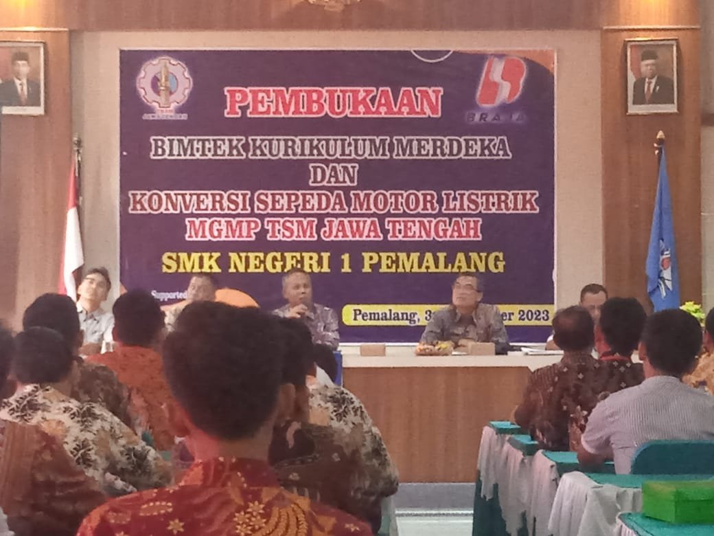 BN News. Pemalang || Musyawarah Guru Mata Pelajaran (MGMP) Teknik Sepeda Motor (TSM) Jawa Tengah menggelar kegiatan Bimbingan Teknis (Bimtek) Implementasi Kurikulum Merdeka dan Konversi Sepeda Motor Listrik se-Jawa Tengah di Grand Wijaya Hotel Kabupaten Pemalang Jawa Tengah.