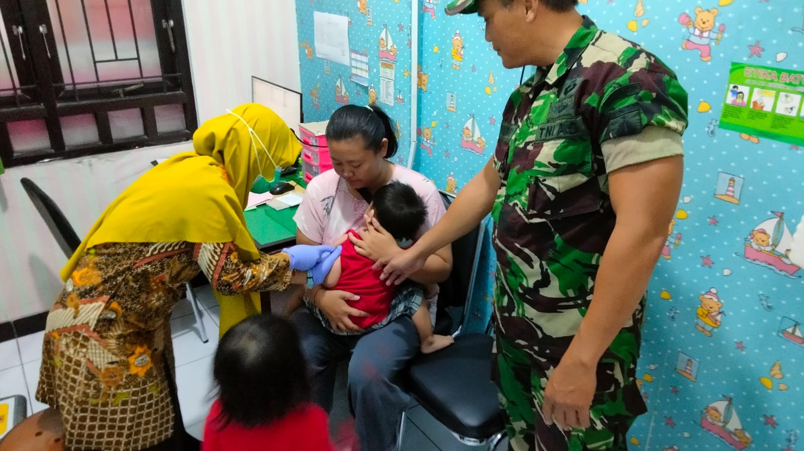Bati Bakti TNI Sersan Mayor Yudhi Widianto Koramil 03 / Serengan Kodim 0735 / Surakarta Melaksanakan Pendampingan kegiatan Pelayanan Imunisasi Bayi di UPT Puskesmas Kratonan Di Jln. Pringgodani No.34 Kratonan Serengan Kota Surakarta.  Selasa (07/11/2023).