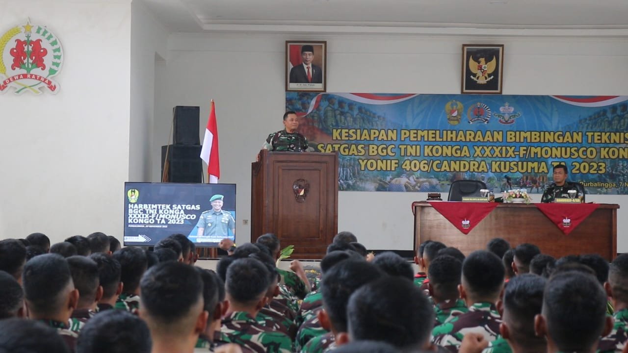 BN News. Purbalingga || Bertempat di Aula Yonif 406/CK, Paban VII/Ops LN Sopsad MabesAD Kolonel Inf Hengki Yuda Setiawan, S.I.P membuka langsung kegiatan Kesiapan Pemeliharaan Bimbingan Teknis Satgas BGC TNI Konga XXXIX-F/MUNOSCO KONGO Yonif 406/CK TA. 2023. Hadir dalam kegiatan Pemeliharaan Bimbingan Teknis Danbrigif-4/Dewa Ratna Letkol Inf Imir Faishal, S.Sos., M.I.Pol dan Danyonif 406/CK Letkol Inf Edward Samosir Serta 300 orang Perwira, Bintara dan Tamtama Yonif 406/CK. Selasa (07/11/2023).