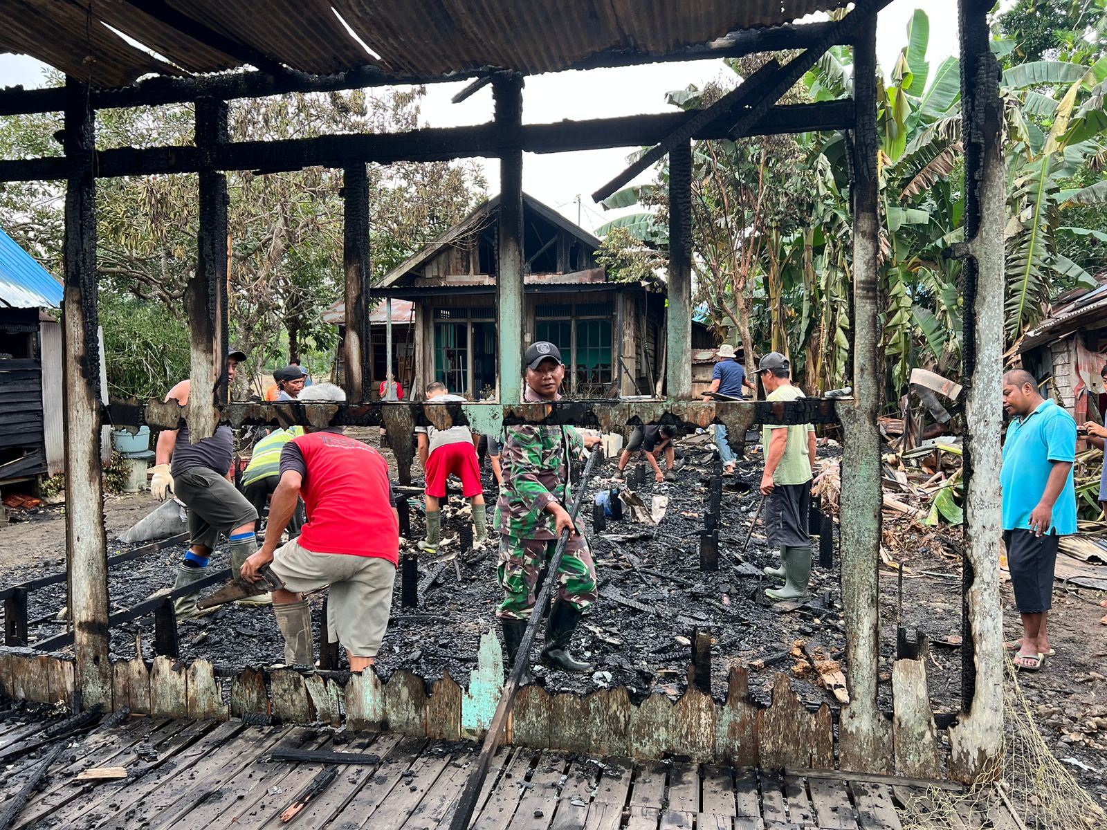 Danramil 1002-06/Barabai Kapten Inf Rudi Hartono disela-sela kegiatan pembersihan puing-puing sisa kebakaran menyampaikan bahwa hari ini kita bersama-sama dengan Polri, relawan dan warga sekitar lokasi membersihkan puing-puing sisa kebakaran,”ujarnya.
