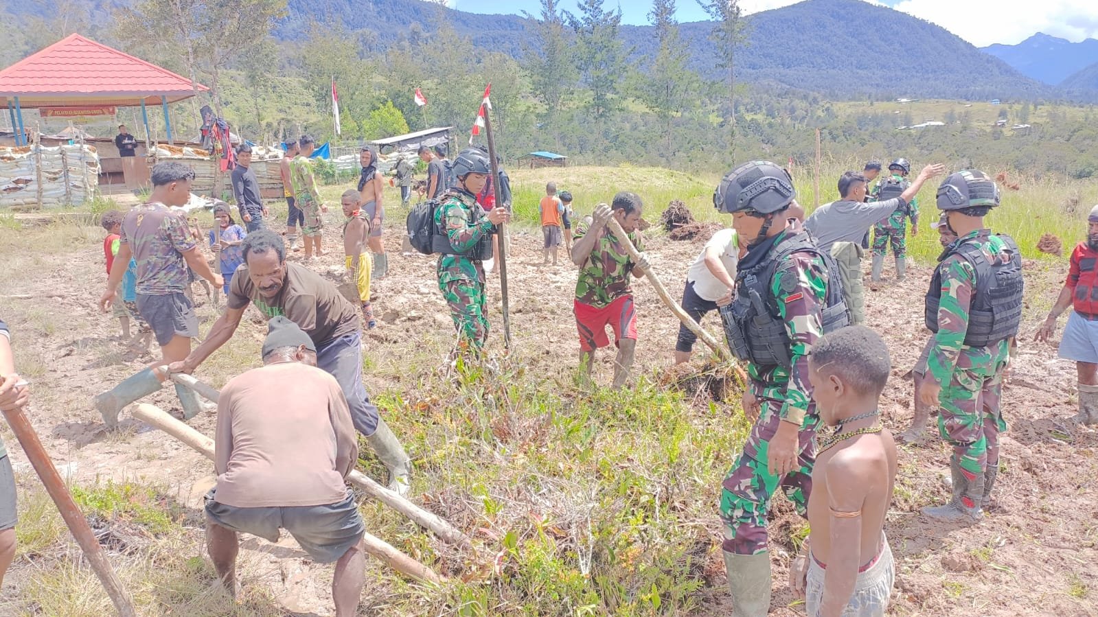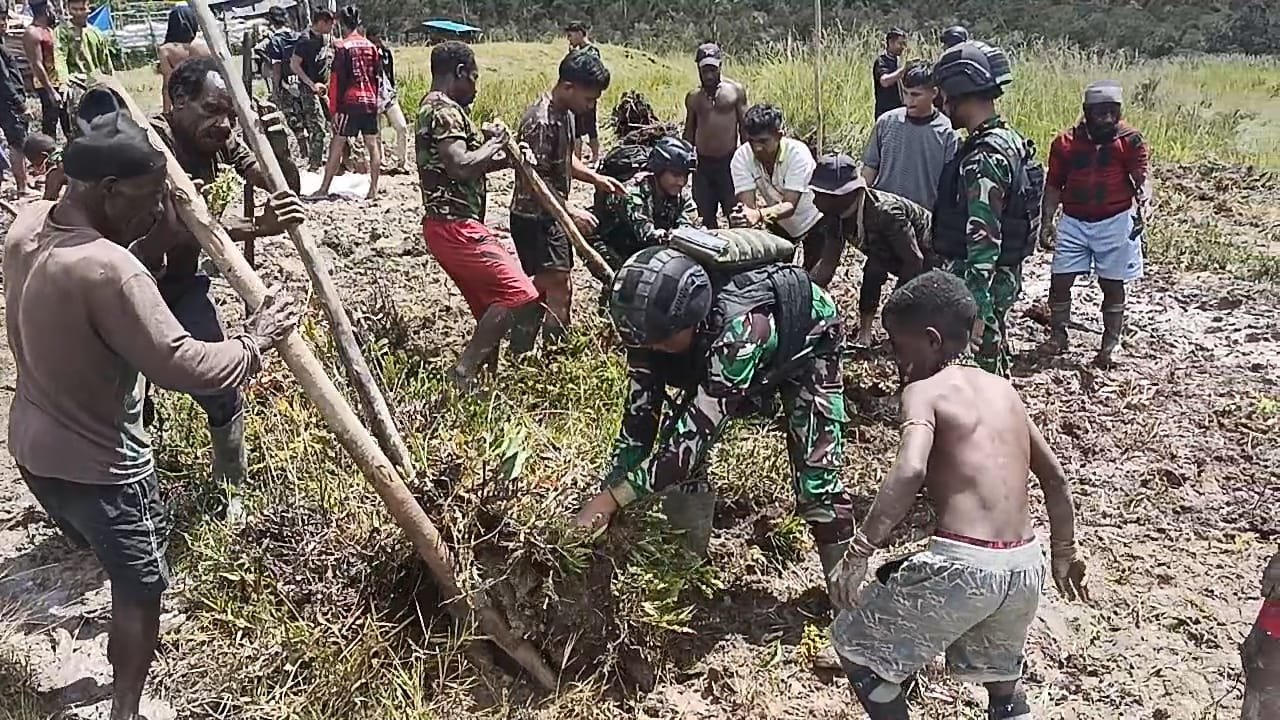 BN NEWS || Kab. Puncak – Dalam rangka meningkatkan kesejahteraan dan kebersamaan masyarakat di wilayah Papua, Satuan Tugas Mobile Raider 300 Siliwangi Pos Eromaga yang dipimpin oleh Letda Inf Didin melakukan kegiatan pembangunan lapangan volly di Desa Eromaga, Distrik Ilaga, Kabupaten Puncak, Papua dengan melibatkan anggota Satgas dan masyarakat setempat.