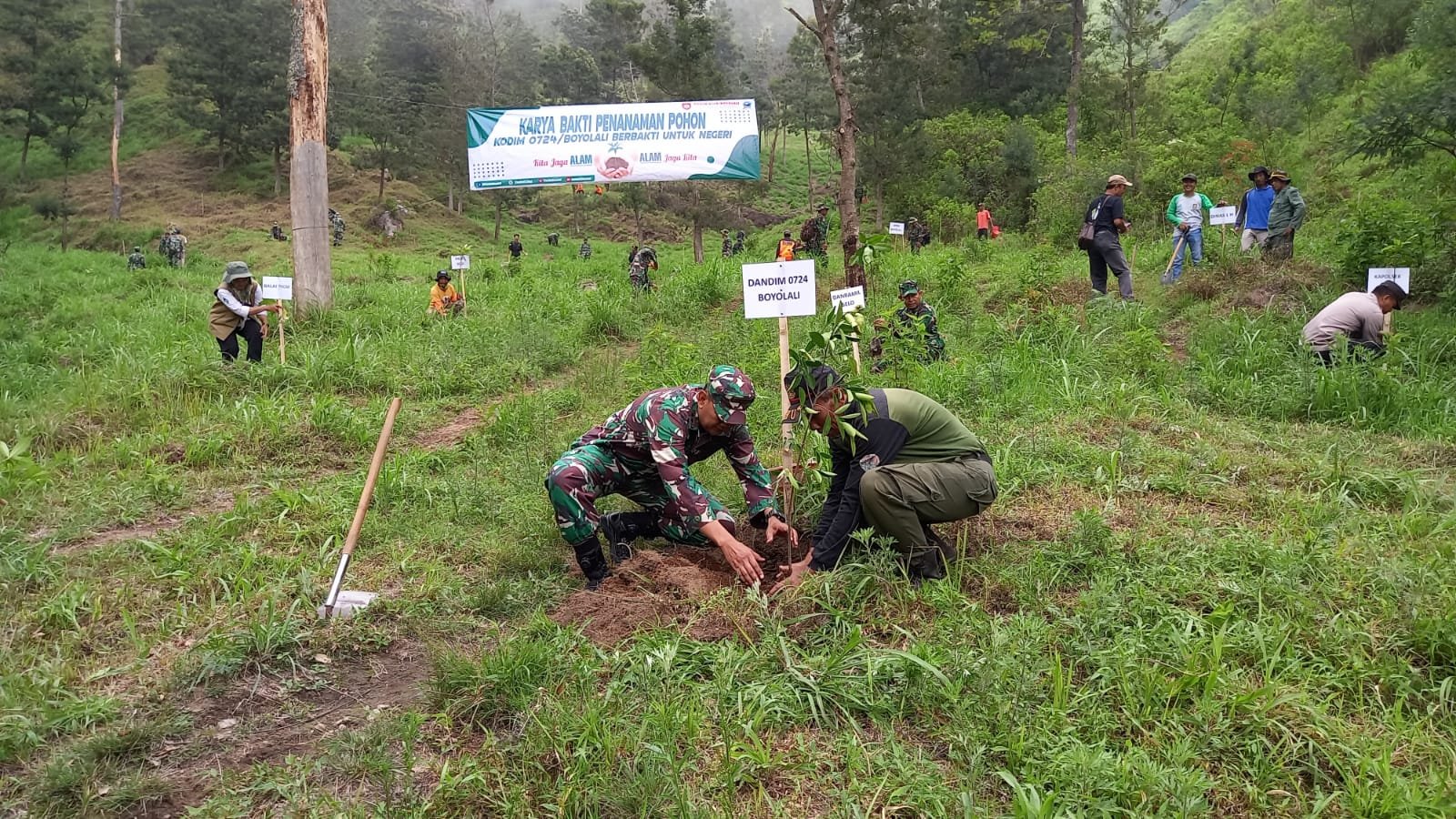 BN News. Boyolali || Kodim 0724/Boyolali melakukan reboisasi ( Penghijauan ) di kawasan Taman Nasional lereng Gunung Merbabu sekitar Tuk Babon Dukuh Selowangan Desa Selo Kecamatan Selo Kabupaten Boyolali, Kamis ( 7/12/23).