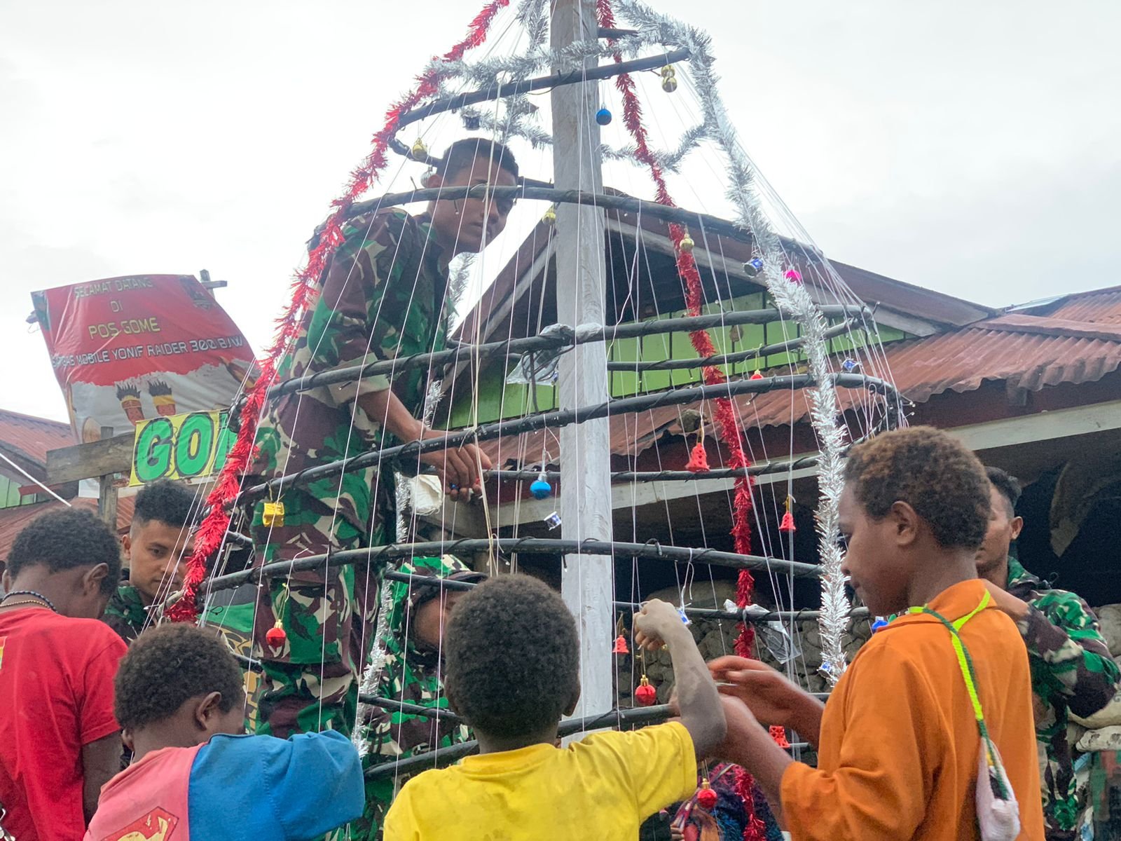 BN NEWS || Kab. Puncak – Satgas Mobile Raider 300 Siliwangi yang bertugas di wilayah Distrik Gome, Kabupaten Puncak, Papua, mengajak anak-anak setempat untuk membuat pohon Natal bersama. Kegiatan ini dilakukan sebagai bentuk kepedulian dan keakraban Satgas dengan masyarakat Papua, khususnya anak-anak.