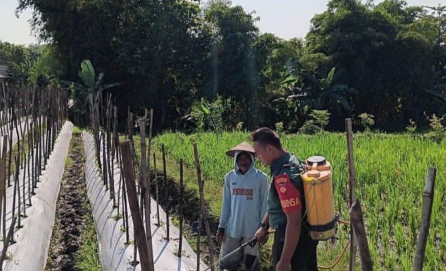 BN News. Sragen || Serda Suratno Babinsa Desa Sepat Koramil 03/Masaran Kodim 0725/Sragen membantu petani dalam melakukan penyemprotan pestisida ke tanaman melon agar terhindar dari kerusakan yang disebabkan oleh hama, Rabu (13/12/2023).