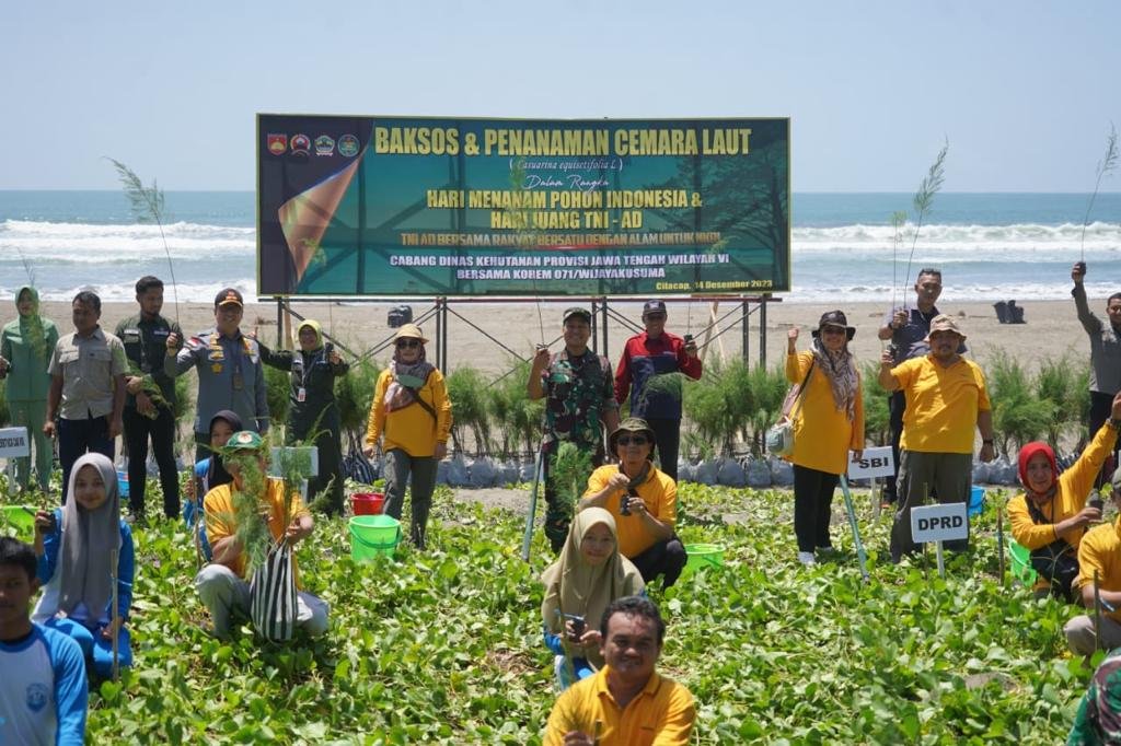 BN News. Cilacap || Lestarikan kawasan wisata pantai Widarapayung di Desa Binangun Kecamatan Binangun Kabupaten Cilacap, dalam rangka memperingati Hari Juang TNI AD yang ke-78 dan hari menanam pohon sedunia tahun 2023, Korem 071/Wijayakusuma berkolaborasi bersama Dinas Kehutanan Provinsi Jawa Tengah Wilayah VI, menanam ribuan pohon penghijauan Cemara Laut. Kamis (14/12/2023).