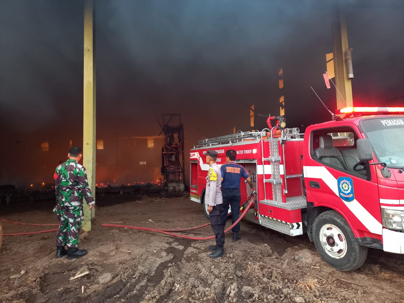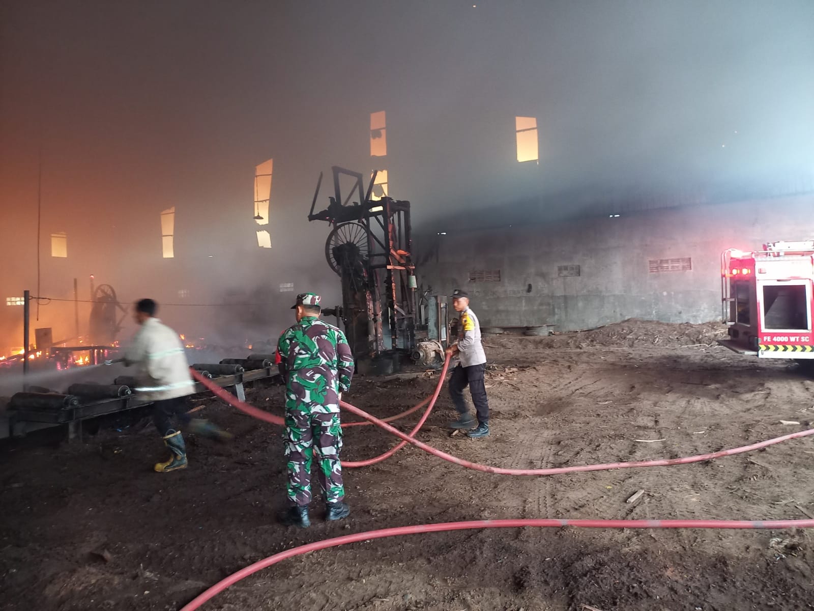 BN News. Demak || Babinsa Desa Kalitengah Koramil 12/Mranggen Sertu Somyani bersama Babinkamtibmas Bripka Munadi berupaya membantu mencegah kebakaran Pabrik Swamill penggergajian kayu PT. Hasil Sukses Berdikari (HSB) milik Bapak H. Muhtarom yang beralamat di RT 06 RW 04 Dukuh Ngingas Desa Kalitengah Kecamatan Mranggen Kabupaten Demak, Minggu (17/12/23).