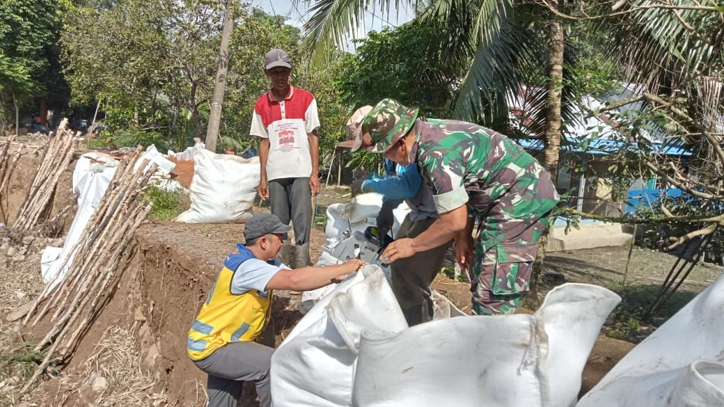 BN News. Barabai || Anggota Koramil 1002-02/Bau bersama warga masyarakat dan Dinas PUPR Kab.Hulu Sungai Tengah memperbaiki tanggul pinggir sungai di desa Awang Baru RT.005 RW.003 Kec.Batang Alai Utara.Sabtu (30/12/2023).