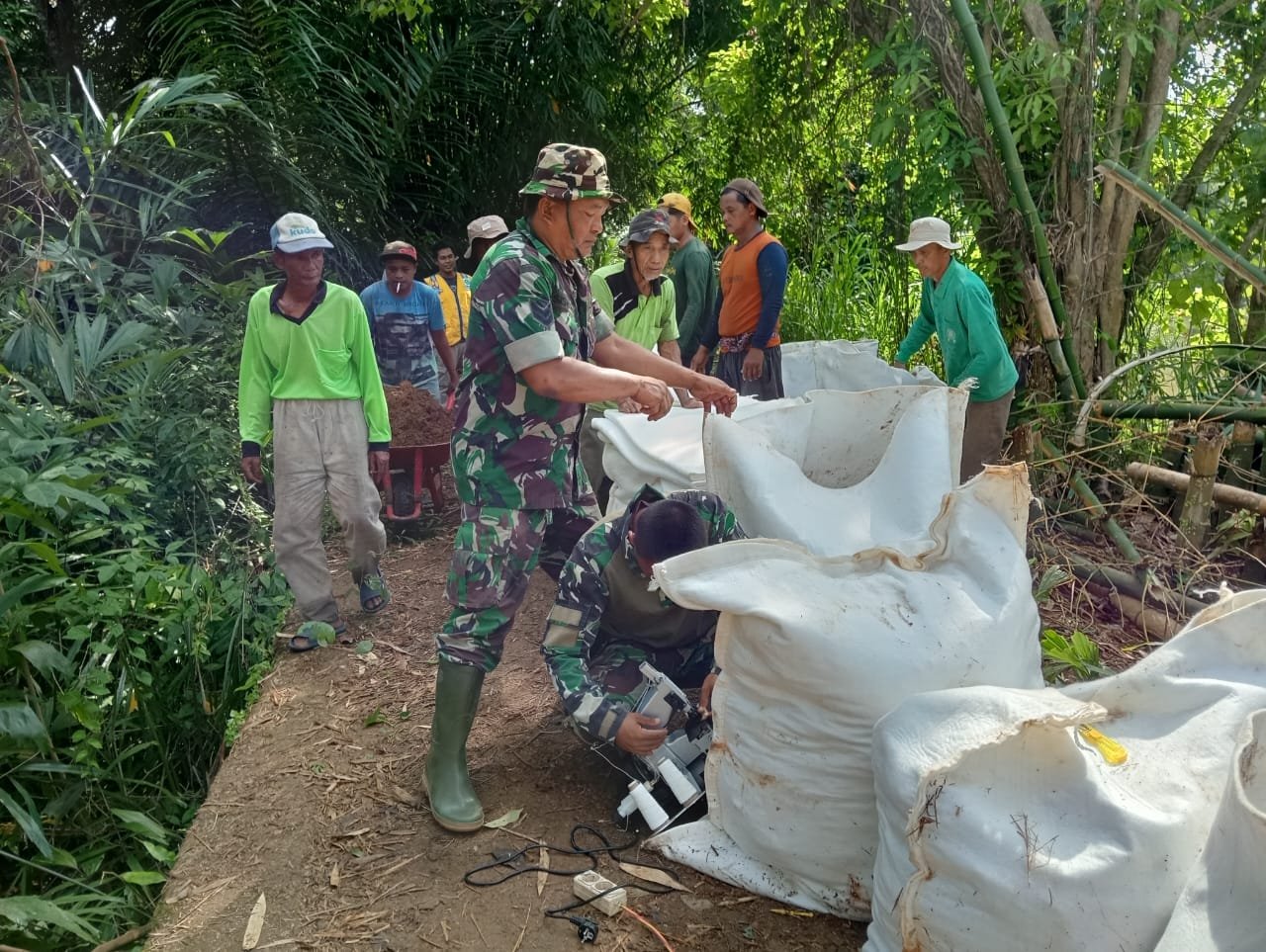 Anggota Koramil 1002-02/Batang Alai Utara bergotong royong memperbaiki tanggul sungai menggunakan karung plastik yang diisi tanah untuk memperbaiki tanggul yang longsor,