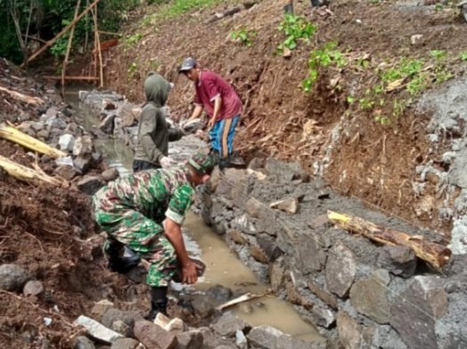 Babinsa Serma Joko Mulyono mengatakan kami bersama masyarakat gotong royong mengejar proses pembuatan talud sebagai upaya antisipasi terjadinya longsor.