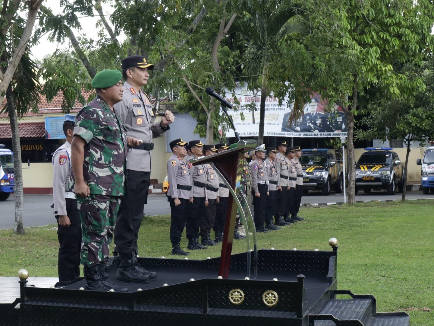 BN News. Pemalang || Komandan Kodim (Dandim) 0711/Pemalang Letkol Inf Ade Afri Verdaniex, S.I.P., bersama Kapolres AKBP Yovan Fatika Handiska Aprilaya, S.I.K., M.H., pimpin Apel pergeseran pasukan pengamanan dalam rangka pengamanan malam tahun baru 2024 di wilayah hukum Polres Pemalang. dan sebagai Komandan Apel KBO Sat Intelkam Polres Pemalang Iptu Suritno, SH.