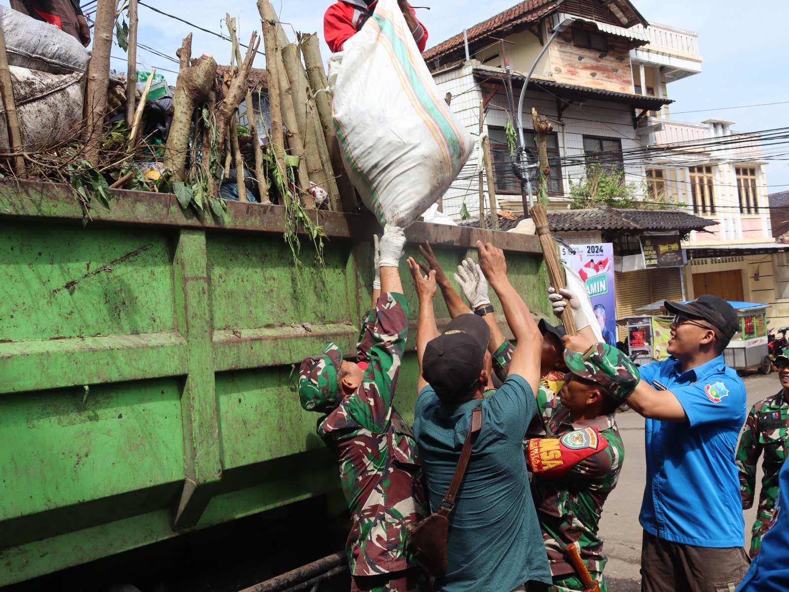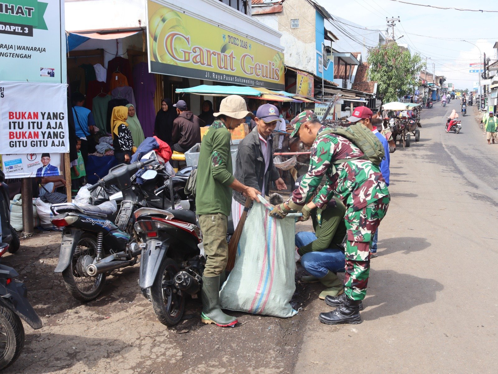 BN NEWS || Garut – Kodim 0611/Grt menggelar kegiatan Karya Bakti pembersihan sampah di pasar tradisional (Pasar desa Sukamukti), Jln.Sukawening Garut, pada selasa (08/01/2024).