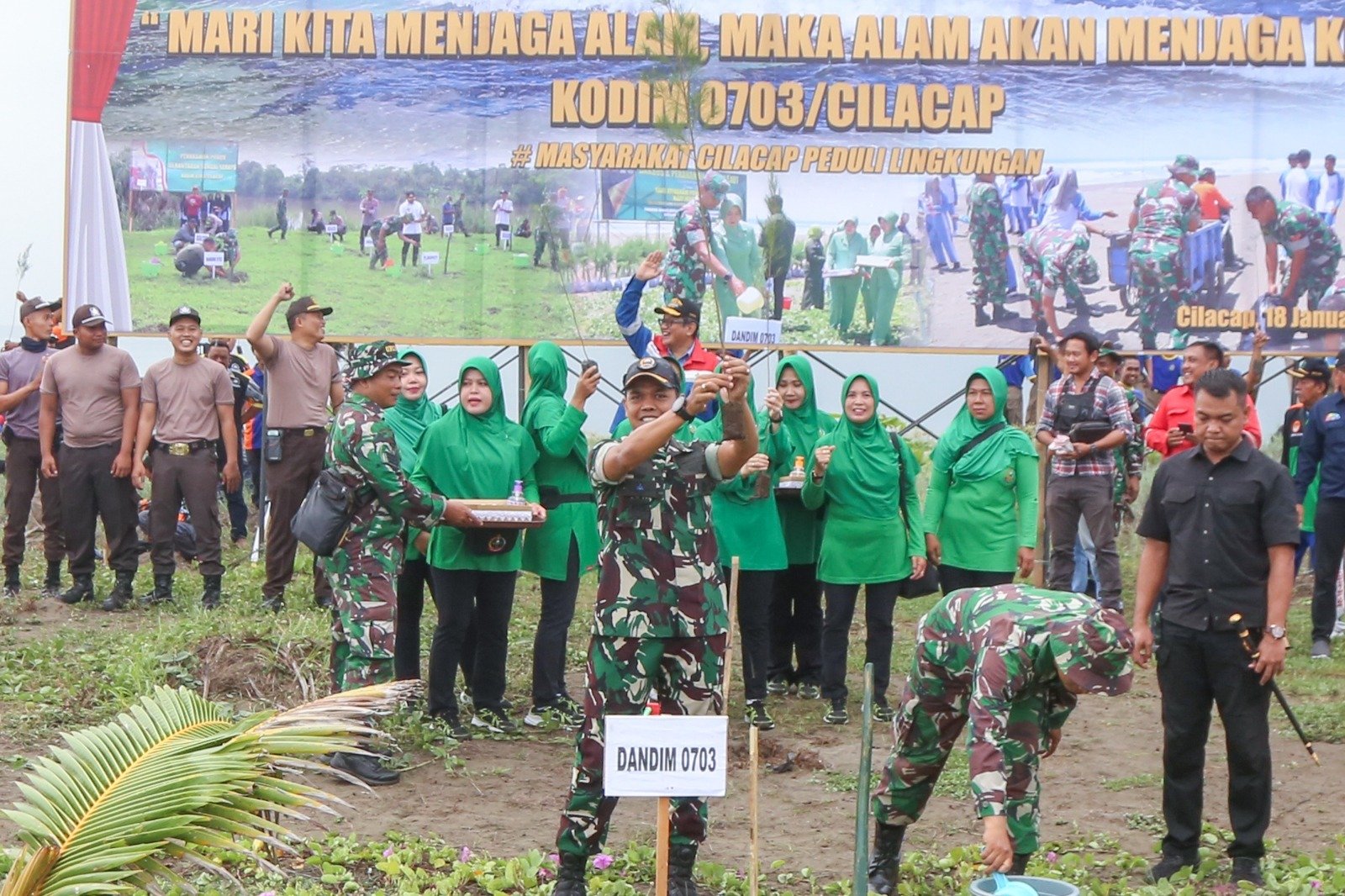 BN News. Cilacap || Kodim 0703/Cilacap Korem 071/Wijayakusuma kembali melaksanakan penanaman pohon, saat ini menanam 1000 pohon di pesisir Pantai Teluk Penyu, setelah penanaman dilanjutkan dengan pembersihan pantai dan bakti sosial pemberian sembako gratis di Kelurahan Cilacap, Kecamatan Cilacap Selatan Kabupaten Cilacap, Kamis (18/1/2024).