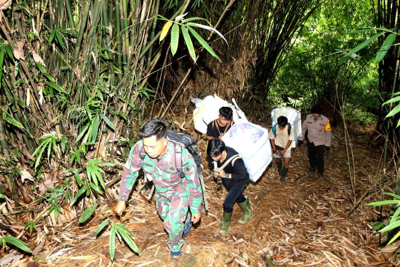 BN News. Barabai || Dua Hari jalan kaki di tengah hutan belantara Meratus, TNI-Polri kawal logistik pemilu 2024 ke TPS Terluar di Desa Juhu Kecamatan Batang Alai Tidur Kab.Hulu Sungai Tengah.
