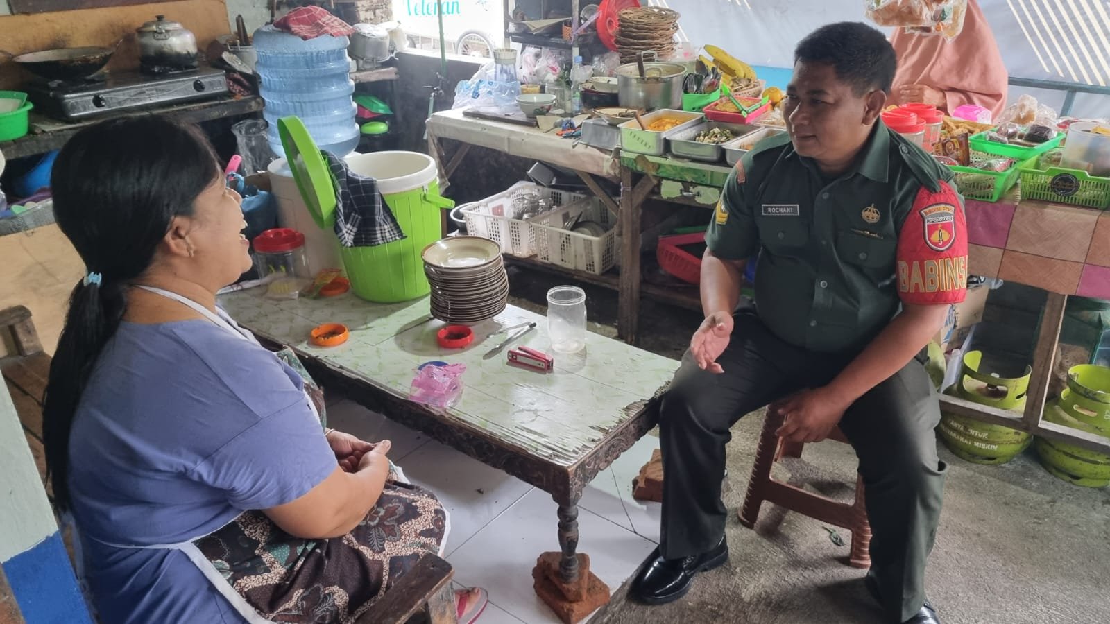 BN News. Surakarta || Babinsa Kelurahan Danukusuman Koramil 03/Serengan Kodim 0735/Surakarta Sertu Rochani melaksanakan kegiatan Anjangsana dan Komsos dengan pedagang makanan ibu wartini RT 02 rw 07 Danukusuman Serengan Kota Surakarta, Sabtu (09/03/2024) Pukul 09:00 WIB.
