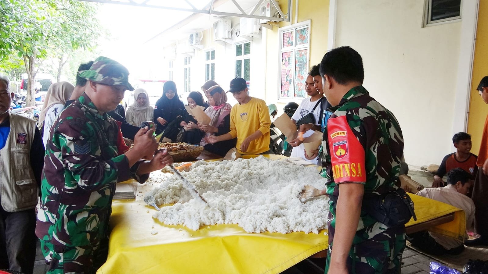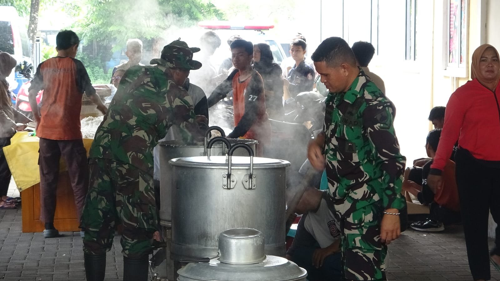 BN News. Pekalongan || Prajurit Kodim 0710/Pekalongan bersama Pemkot, Tagana, BPBD, Relawan hingga para insatansi terkait mendirikan dapur umum terpadu di Halaman Kantor Dinas Sosial untuk para pengungsi banjir di Pekalongan. Dimana hal tersebut ditujukan untuk memenuhi kebutuhan pangan ditengah keterbatasan akibat bencana yang melanda.