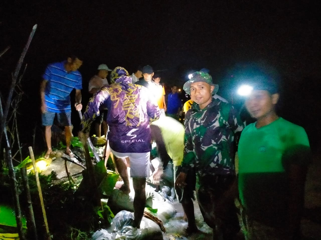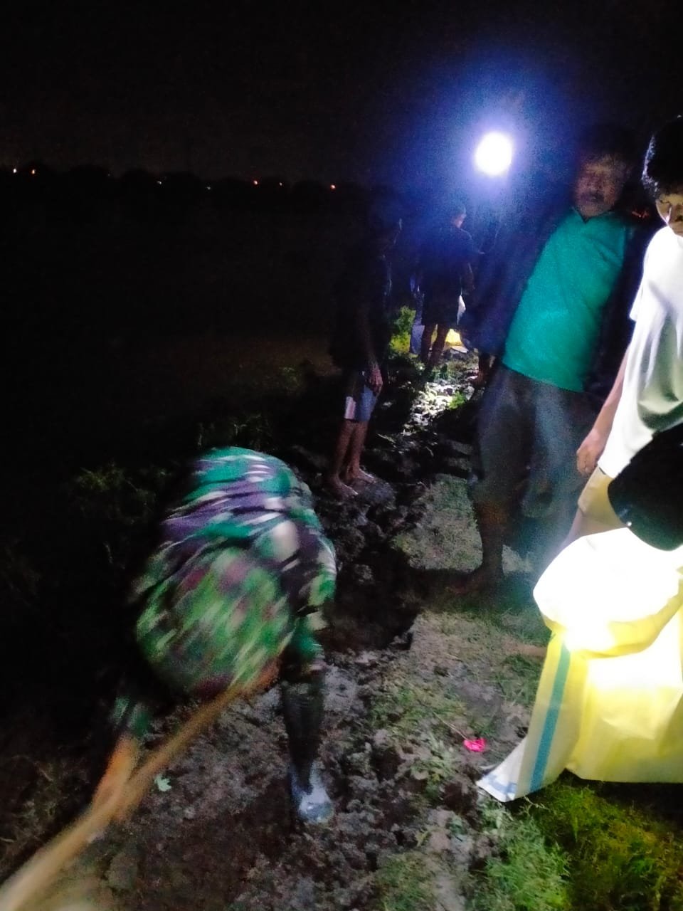 BN News. Demak || Babinsa Koramil 03/Wonosalam Kodim 0716/Demak Serda Sunoto dan Serda Nanang bersama warga masyarakat bergotong royong memperbaiki tanggul jebol akibat derasnya aliran air di dukuh Sampit Desa Sidomulyo Kecamatan Wonosalam Kabupaten Demak, Senin (18/03/2024) Malam