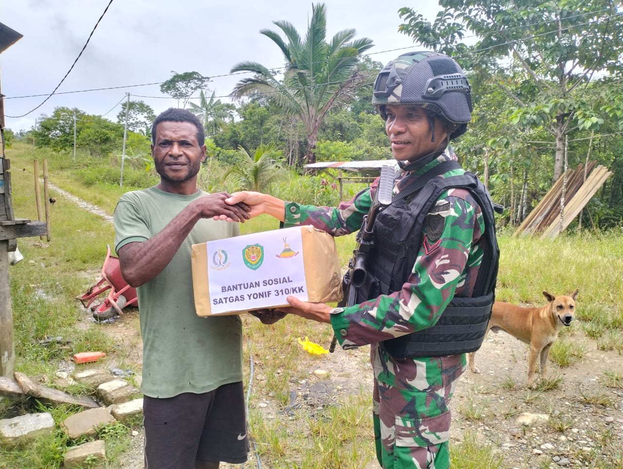 BN NEWS || Keerom Papua – “Jika Tuhan memberi rezeki lebih, maka ia memberimu kesempatan untuk berbagi”, kalimat tersebut yang menjadi inspirasi prajurit Satgas Yonif 310/KK Pos Ubrub dengan membagikan paket sembako bagi warga perbatasan RI-PNG di Kampung Umuaf, Distrik Web, Kabupaten Keerom, Rabu (20/03/2024).