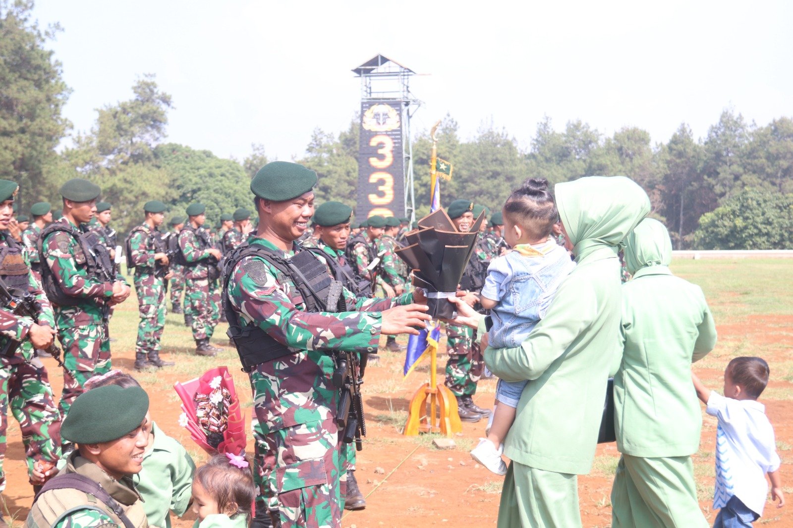 Acara tradisi penyambutan purna tugas Satgas Pamtas Mobile Yonif 330 Tri Dharma yang turut dihadiri oleh Danyon Brimob, Kabasarnas Prov. Jabar, Kasatpol PP Nagreg, Forkopimcam Cicalengka dan keluarga prajurit berlangsung dengan khidmat, aman, tertib dan lancar. (Red)