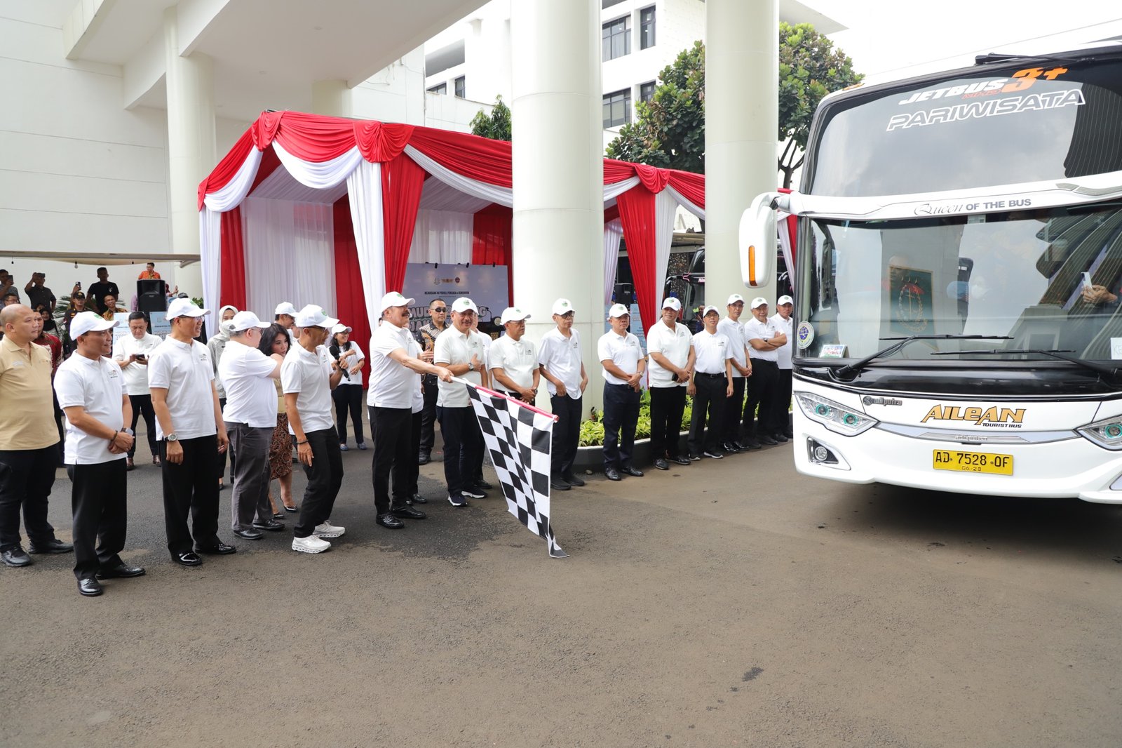 Pelepasan para pemudik ditandai dengan pengibaran bendera start oleh Jaksa Agung ST Burhanuddin beserta para pejabat Eselon I dan Eselon II yang diiringi oleh keberangkatan 14 rombongan bus pada pukul 10.00 WIB.