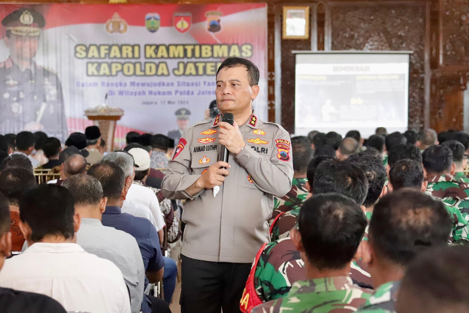 BN News. Jepara || Jangan sedikit sedikit Pidana, berdayakan 3 (tiga) pilar untuk menyelesaikan masalah, ini adalah salah satu Intruksi (arahan atau perintah untuk melakukan sesuatu) Kapolda Jateng Irjen Pol Ahmad Lutfhi saat Safari Kamtibmas bersama 3 (tiga) Pilar di Resto Rimba Desa Turut Desa Kedungcino Kabupaten Jepara. Minggu (12/5/24)