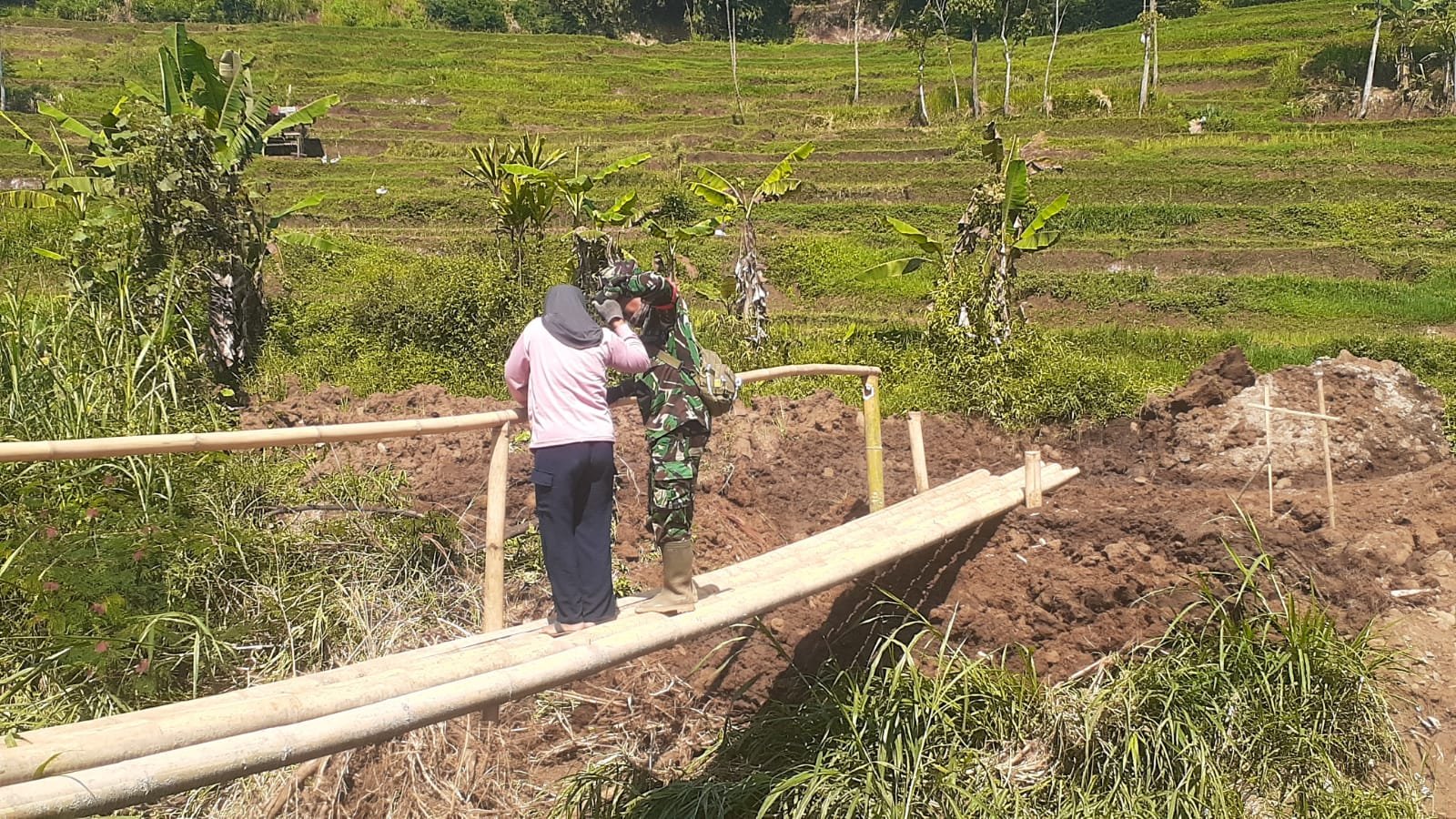 Terpantau oleh awak media Lettu Inf Sumaliq sedang bekerja program jalan TMMD melihat rombongan emak-emak yang hendak menyebrang sungai ketakutan dengan cepat membantu emak-emak menyebrangkan dengan cara menuntunnya hingga selesai melewati jembatan dari bambu.