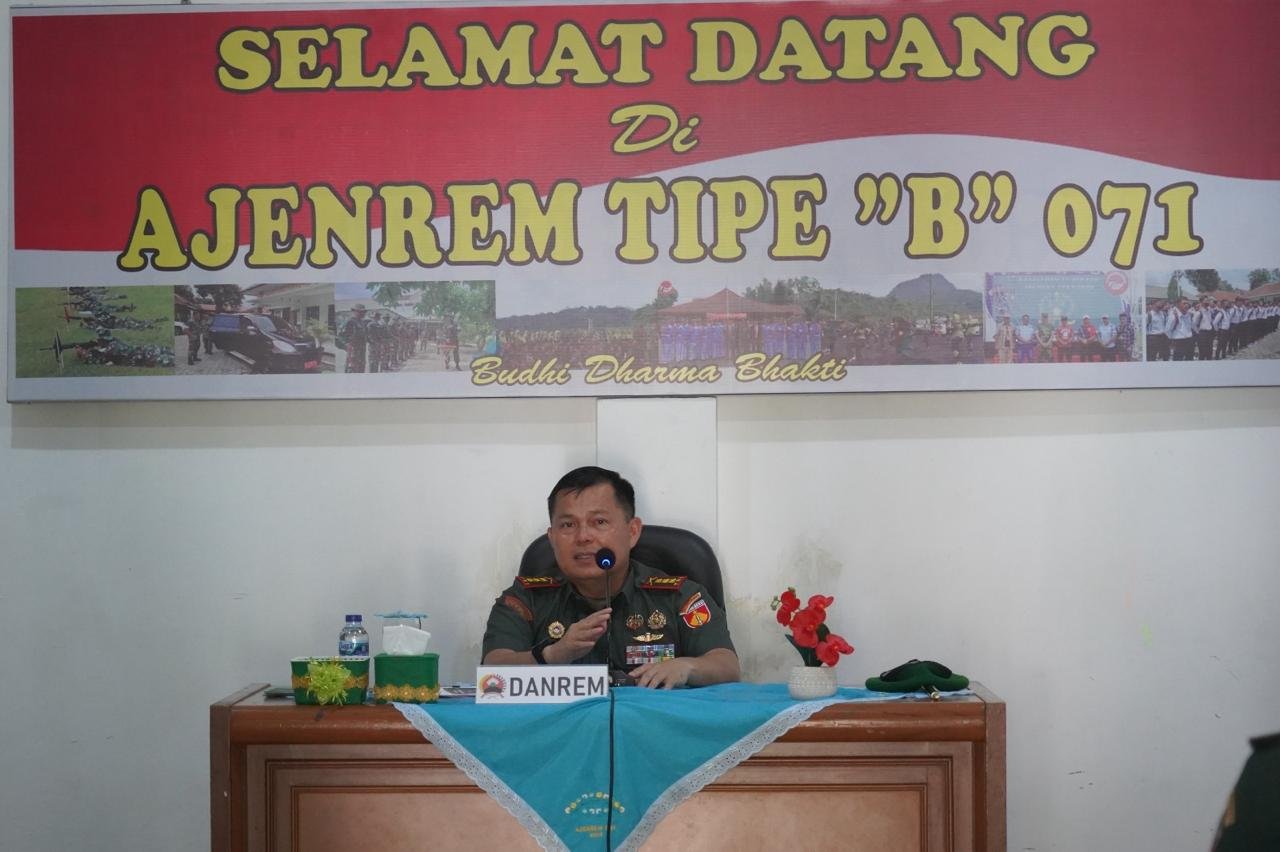 Danrem 071/Wijayakusuma Kolonel Inf Jamaluddin, S. I. P., dengan didampingi Kasiintel, Kasiter dan Pasiopsrem 071/Wijayakusuma dalam arahannya di depan prajurut dan PNS Ajenrem, Denhubrem dan Minvetcad, menyampaikan, kunjungannya disatuan itu untuk bersilaturahmi agar lebih dekat dengan segenap prajurit dan PNS satuan pendampung itu.