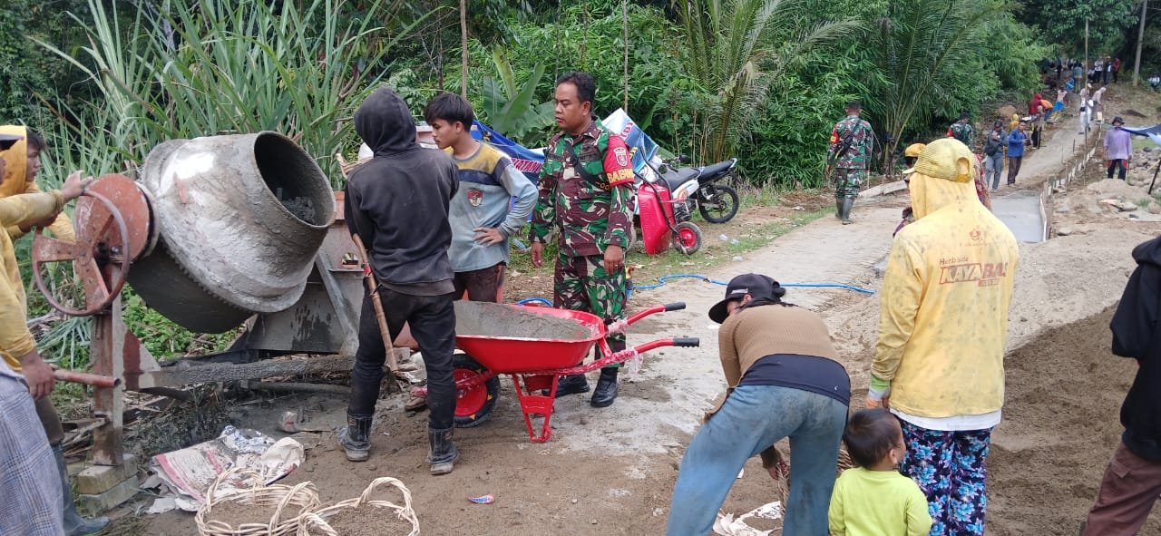 Dipimpin oleh Sertu Agus Rohmad, lima orang Babinsa Koramil 1002-01/Batang Alai Selatan (BAS) berbaur dengan warga masyarakat bahu membahu bergotong royong menggali dan memasang papan untuk pembuatan cor paving blok.