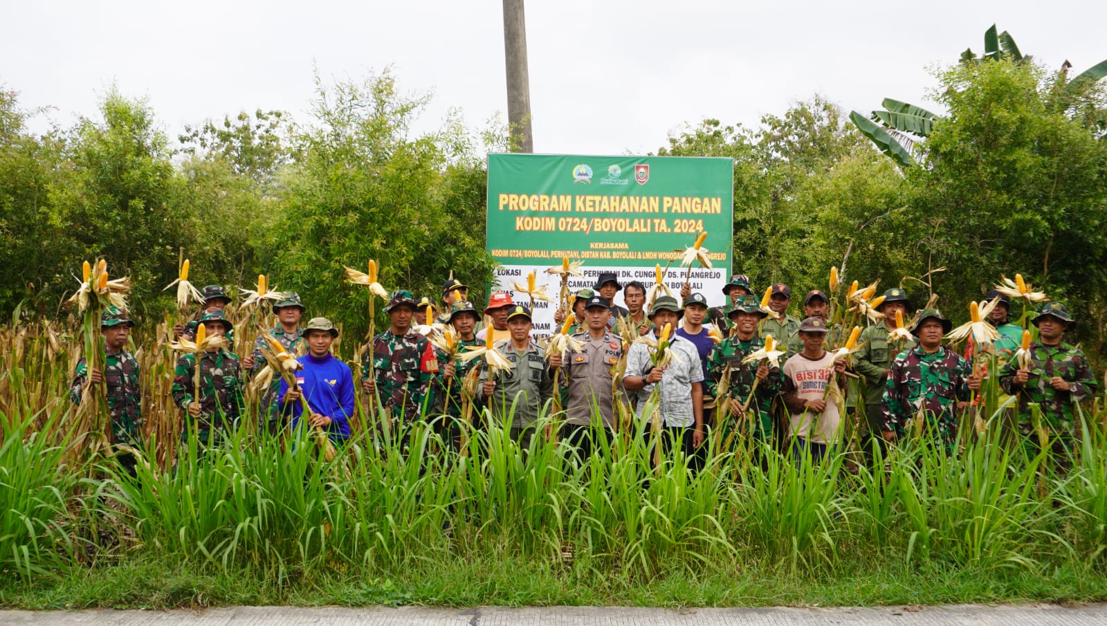 BN News. Boyolali || Untuk mendukung dan mensukseskan program pemerintah dalam bidang ketahanan pangan Kodim 0724/Boyolali yang menyelenggarakan panen raya jagung di lahan perhutani Dukuh Cungkup Desa Pilangrejo Kecamatan Juwangi Kabupaten Boyolali. Sabtu (15/06/2024).