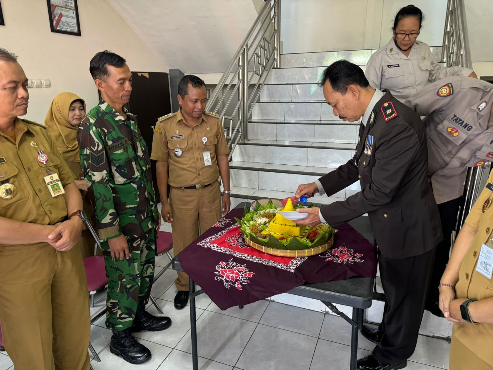 Pada kesempatan tersebut, Bati Komsos Koramil 03/Serengan beserta anggota memberikan kejutan kepada anggota Polsek Serengan dengan memberikan Tumpeng ulang tahun.